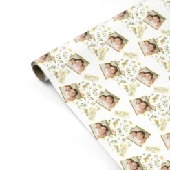 Our Baby Photo Upload Wrapping Paper is a cute design featuring a photograph of your baby, in the shape of a star. Below which you can add a name. The design is set on the wooden effect background. Perfect for the festive season.