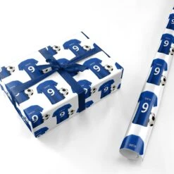Our Blue Personalised Name Age Football Shirt Wrapping Paper is a design that can be customised with any name and number you like. Perfect for birthdays where you can show the age as the number.