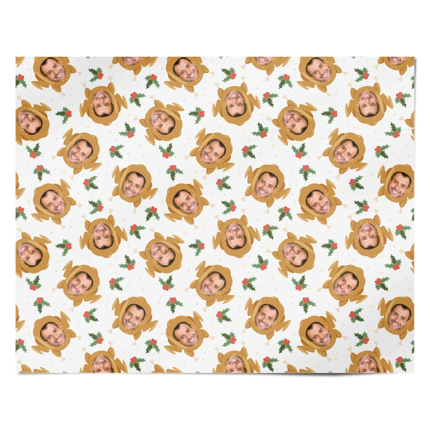 Our Christmas Turkey Photo Face Personalised Wrapping Paper is a fun design that allows you to upload a picture of your face. Our clever tool clips out the face and generates a preview of your design in seconds. The design is of a man wearing a Christmas Turkey hat, perfect for getting into the Christmas spirit.