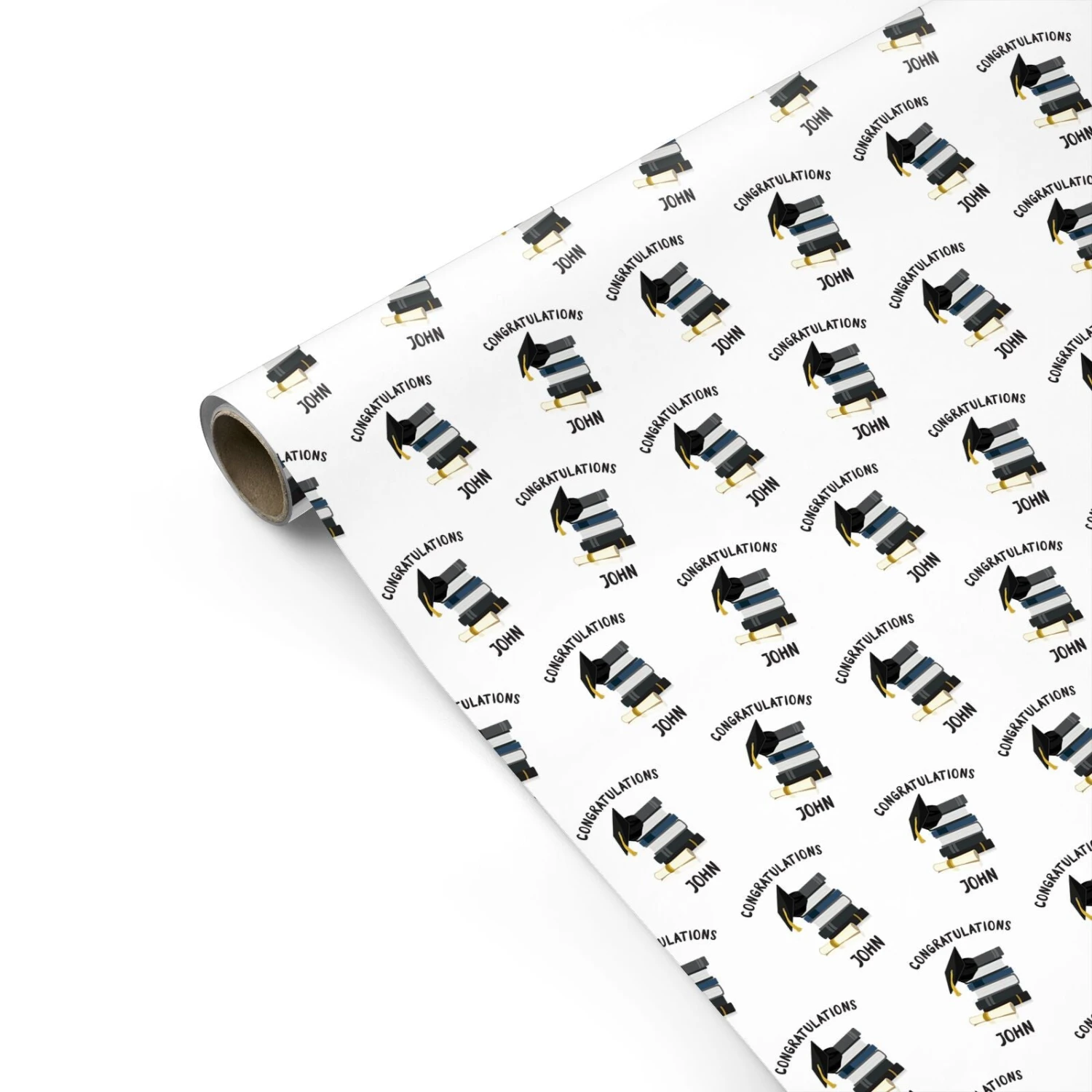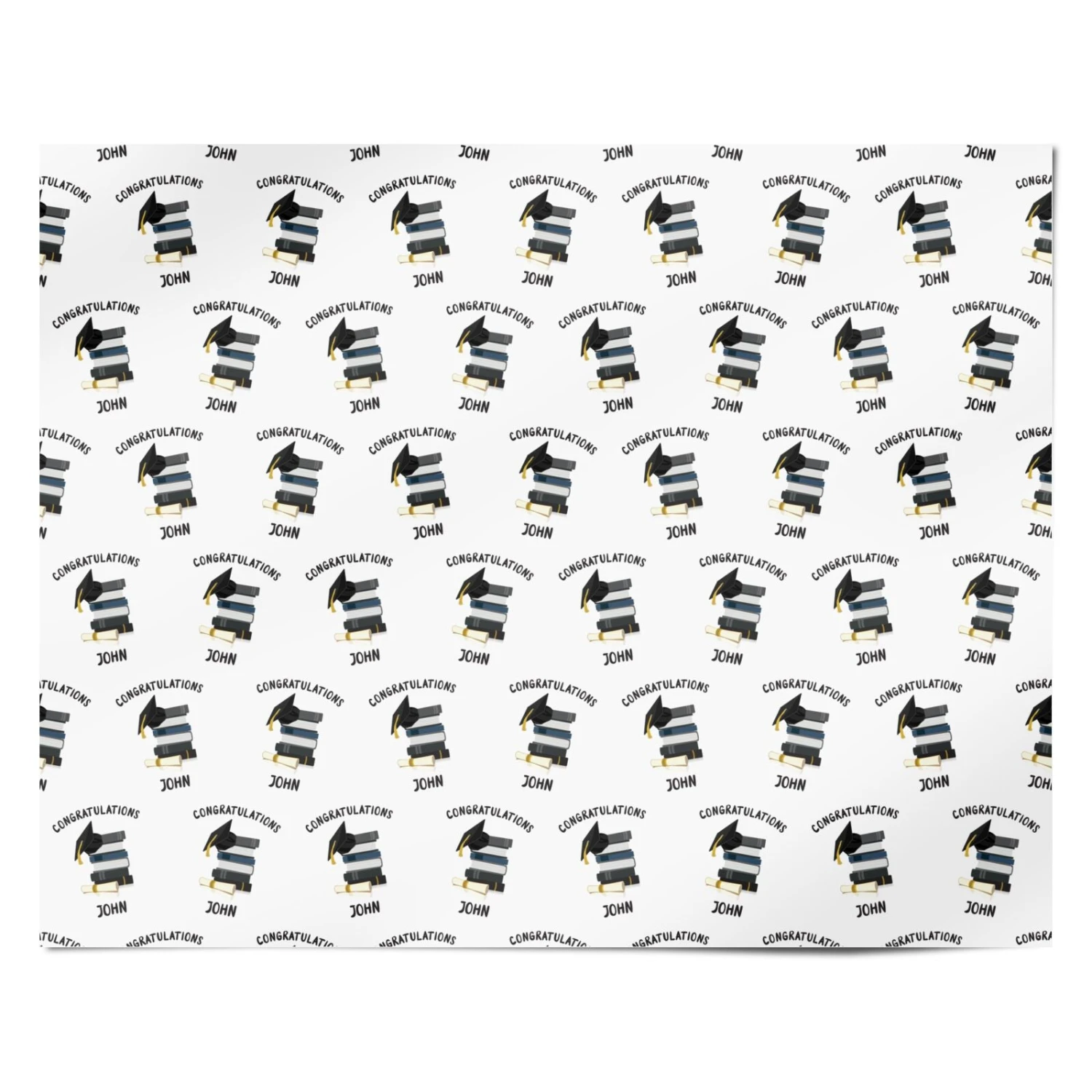 Our Congratulations Graduate Wrapping Paper is a simple graduation design featuring a custom name. The design comprises of a mortar board hat, placed on a stack of books, along with a scroll. A great way to show how proud you are of your new University graduate.