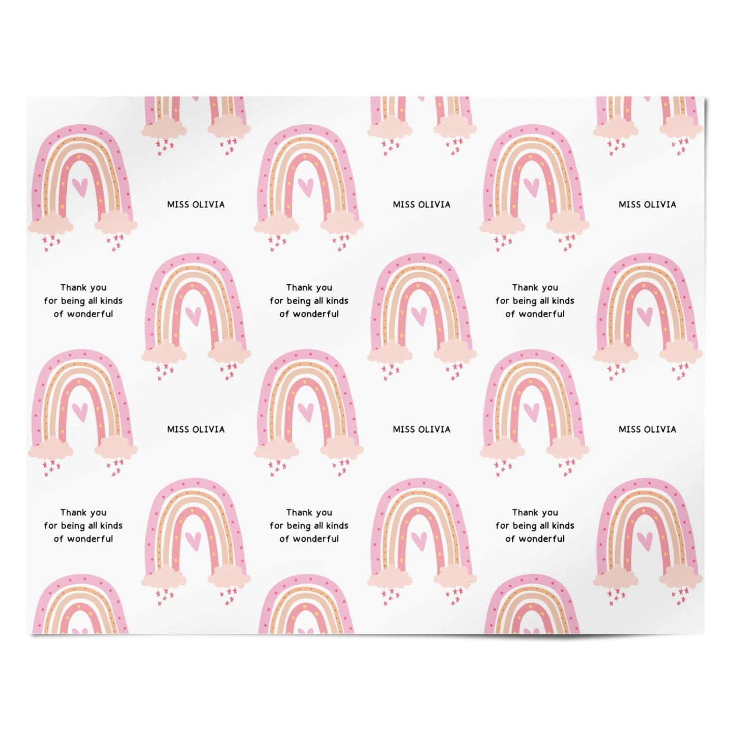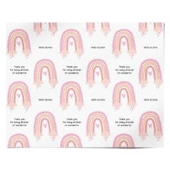 Our Custom Thank You Teacher Wrapping Paper features a thanks teacher quote that says Thanks you for being all kinds of wonderful. Below the quote is a watercolour pink rainbow and the teachers name.