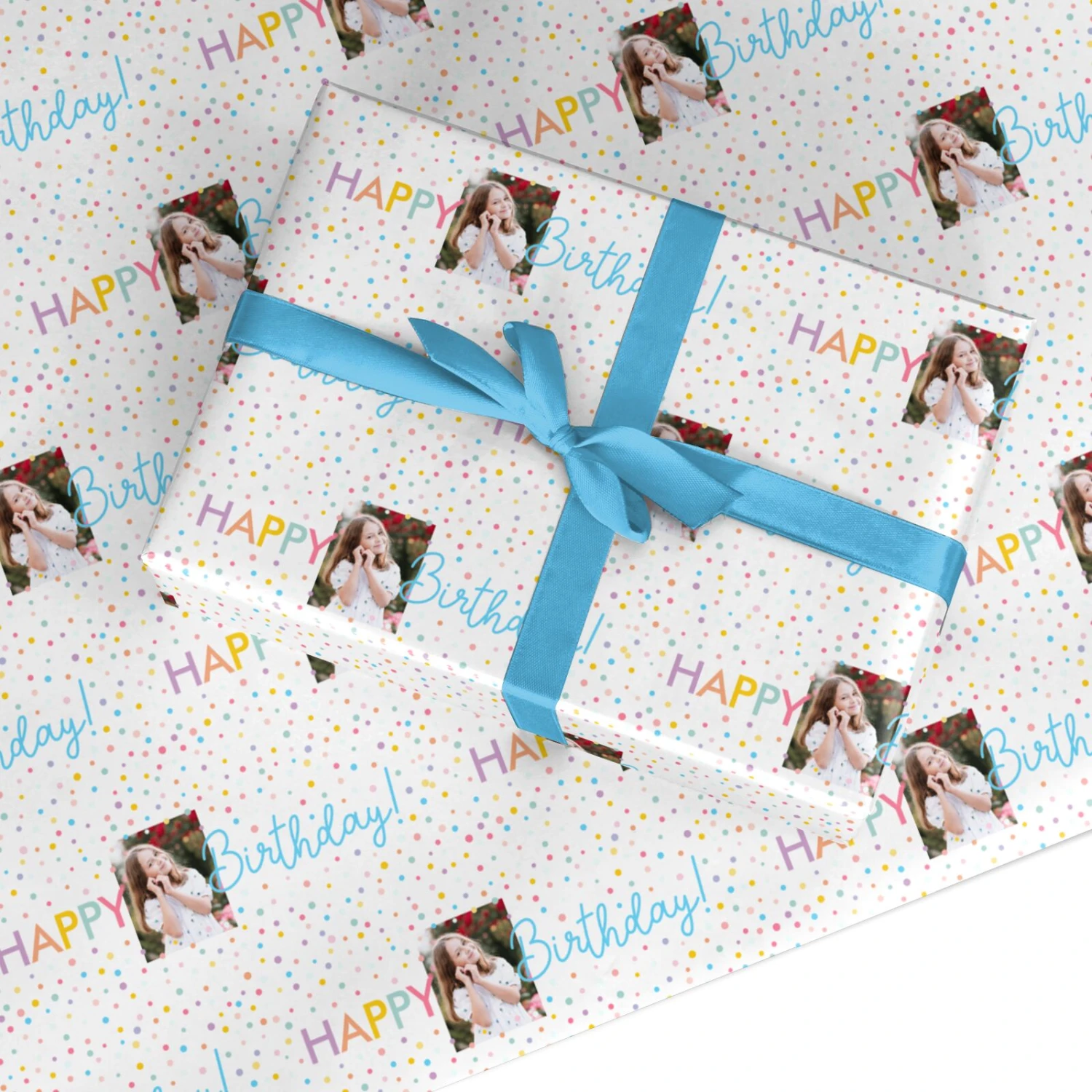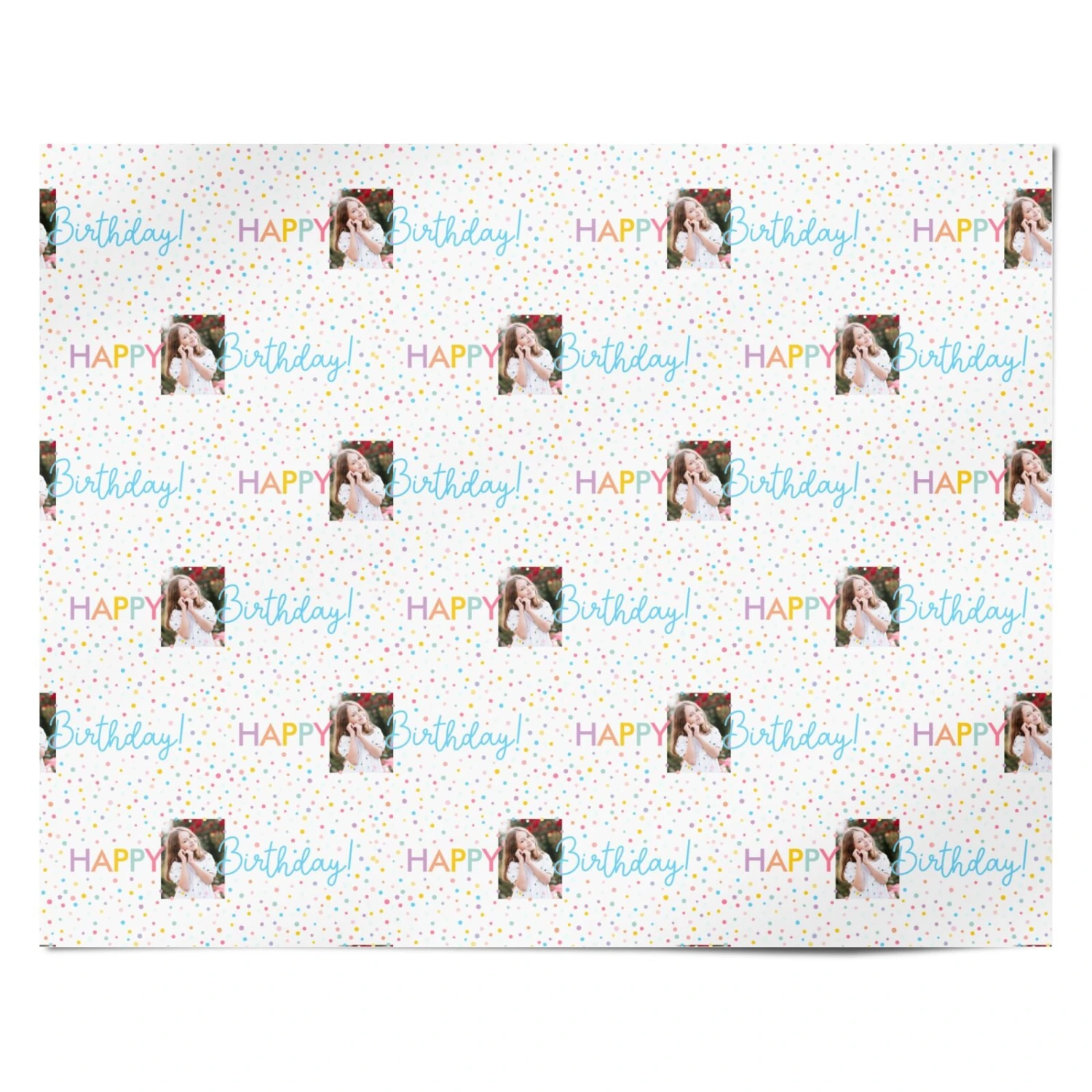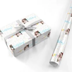 Our Happy Birthday Photo Personalised Wrapping Paper is a vibrant design, with modern colourful Happy Birthday text set on a confetti patterned background. Upload a photo of the birthday boy or girl to make it your own. This design is perfect for children and adults.