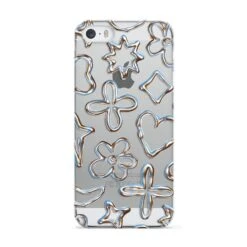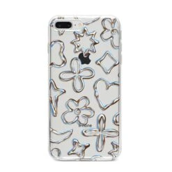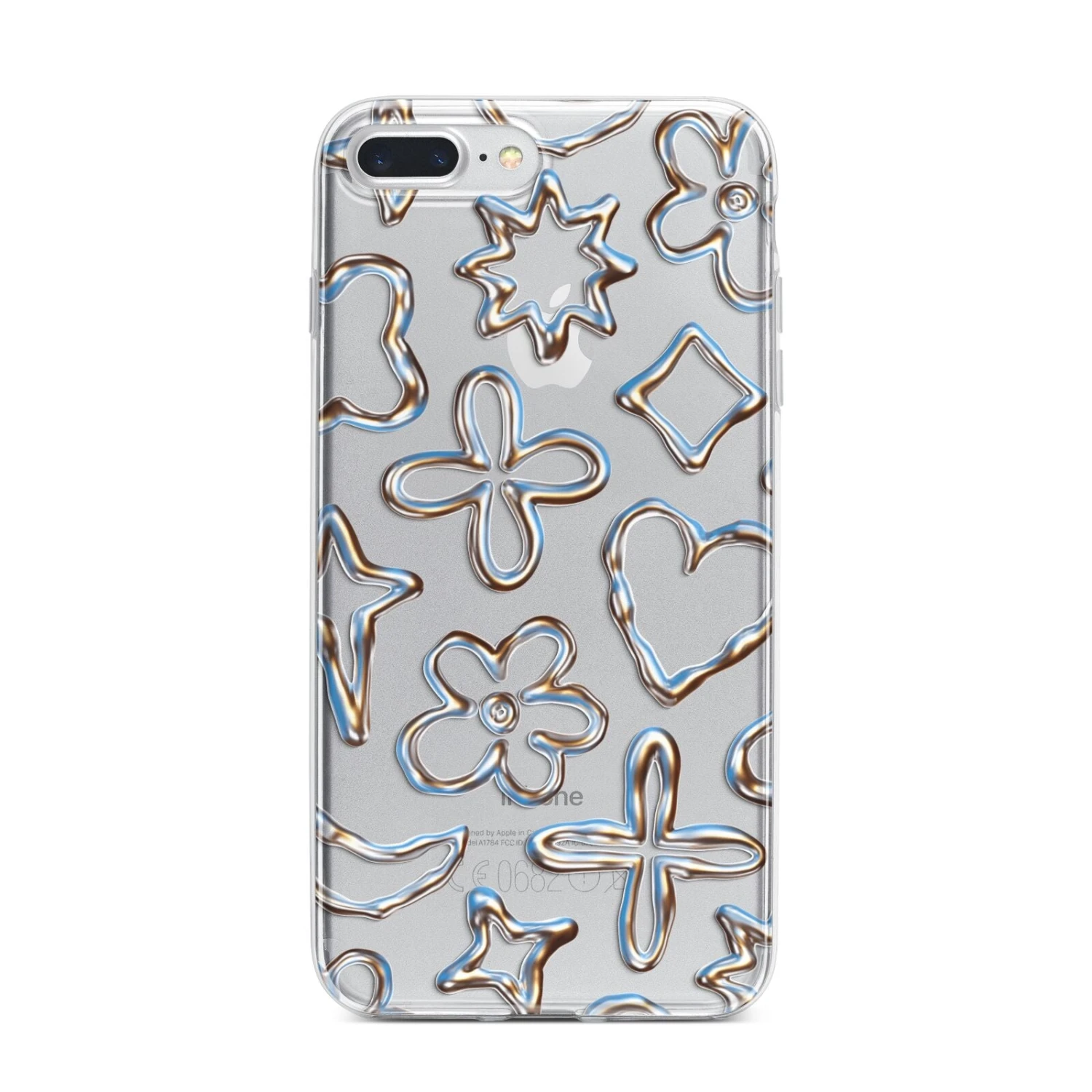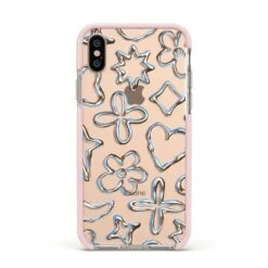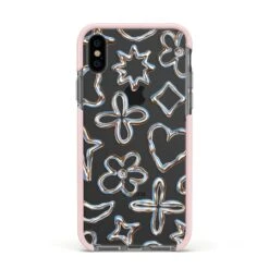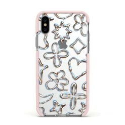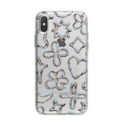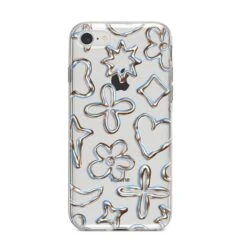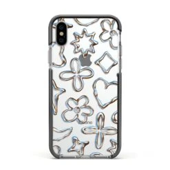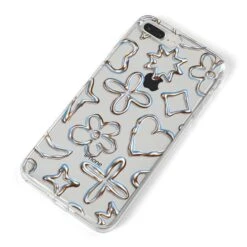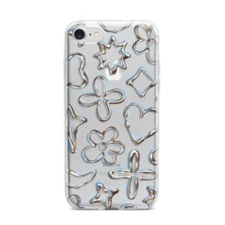 Introducing our Liquid Chrome Doodles phone, featuring a variety of illustrated chrome shapes including hearts and flowers. This stylish and contemporary design is shown against a transparent background. Team with the matching tech accessories and complete your look.