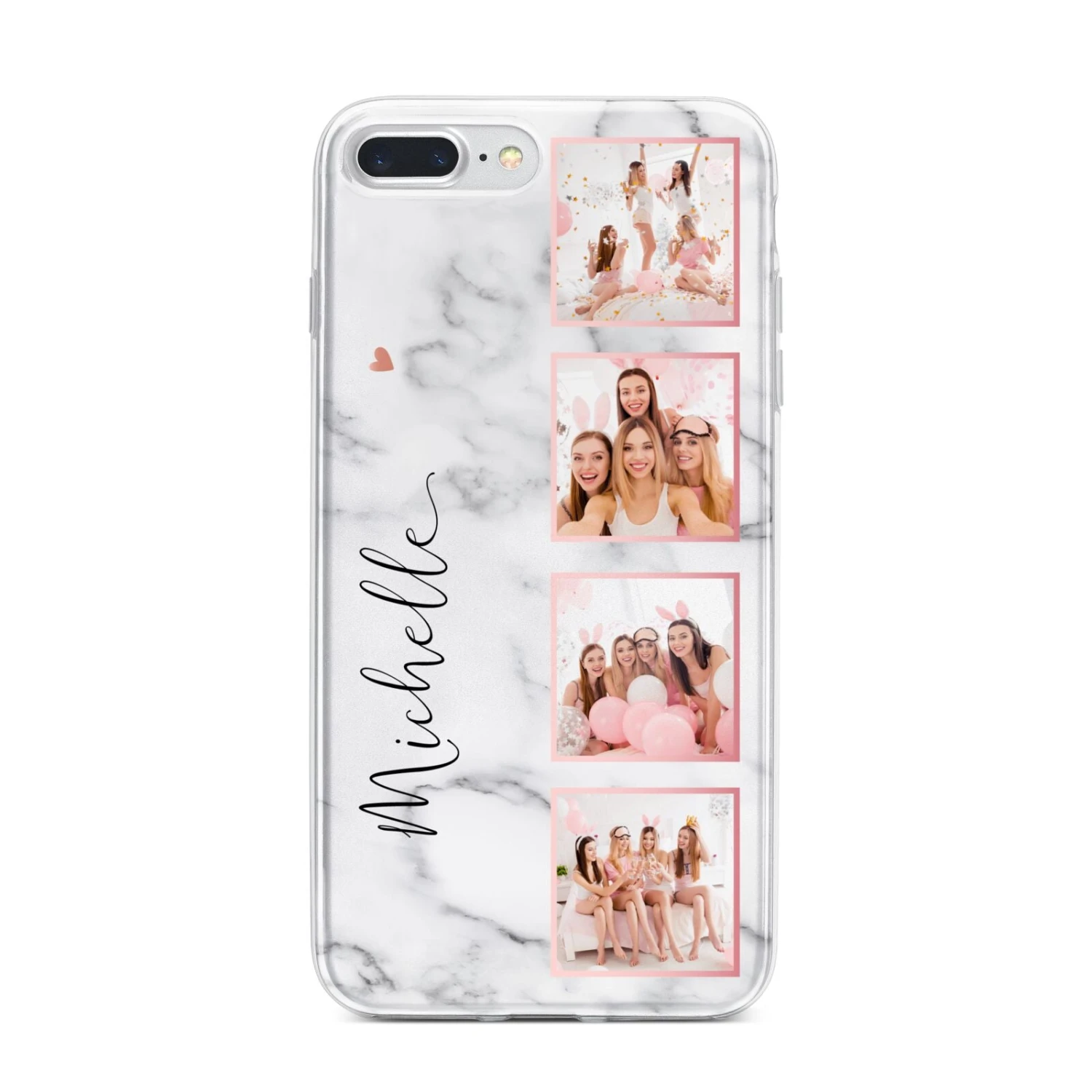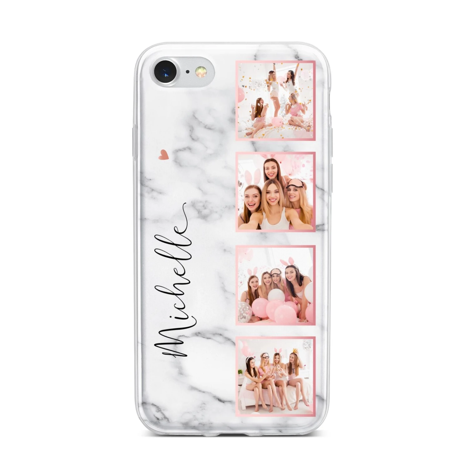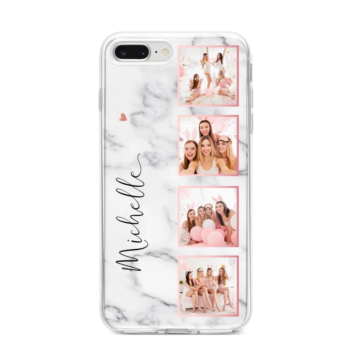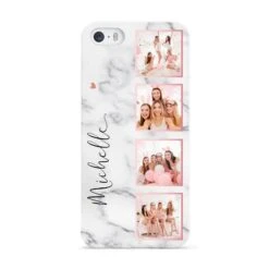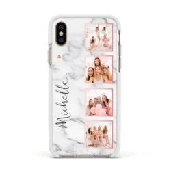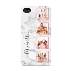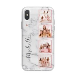 Our Marble Photo Strip Personalised Apple iPhone Case is a four photo upload design, set on a grey and white marble background. The photos are edged in a pink colour. The design also allows for a name to be added.