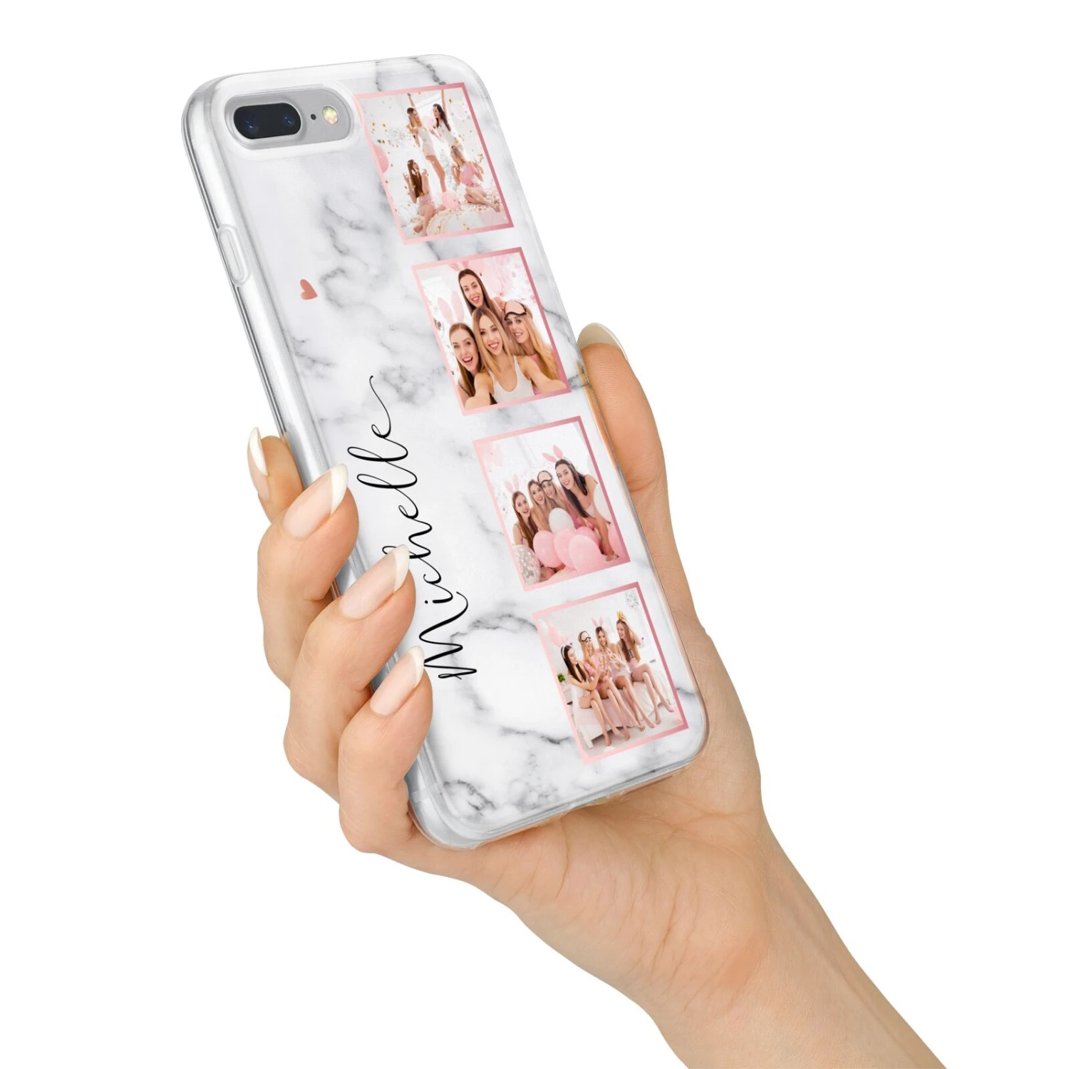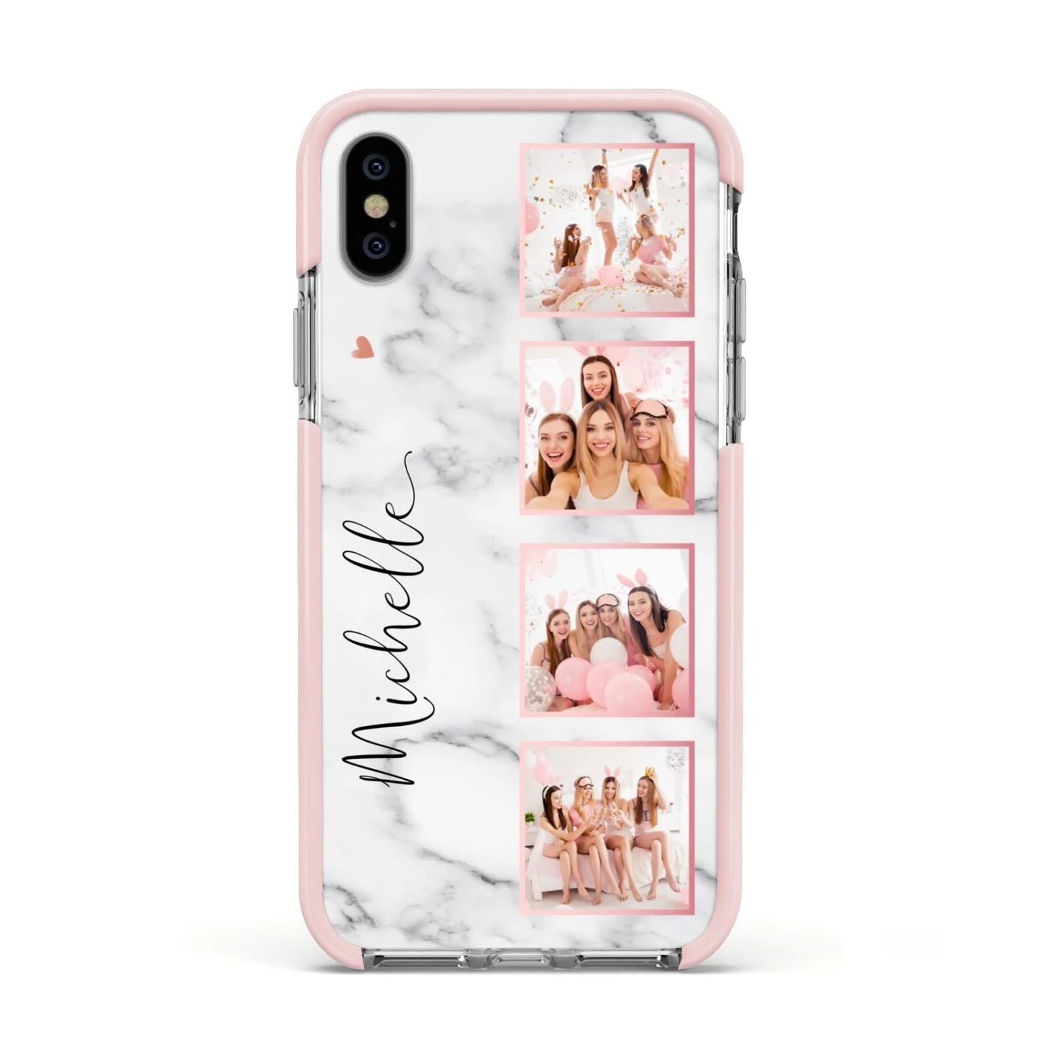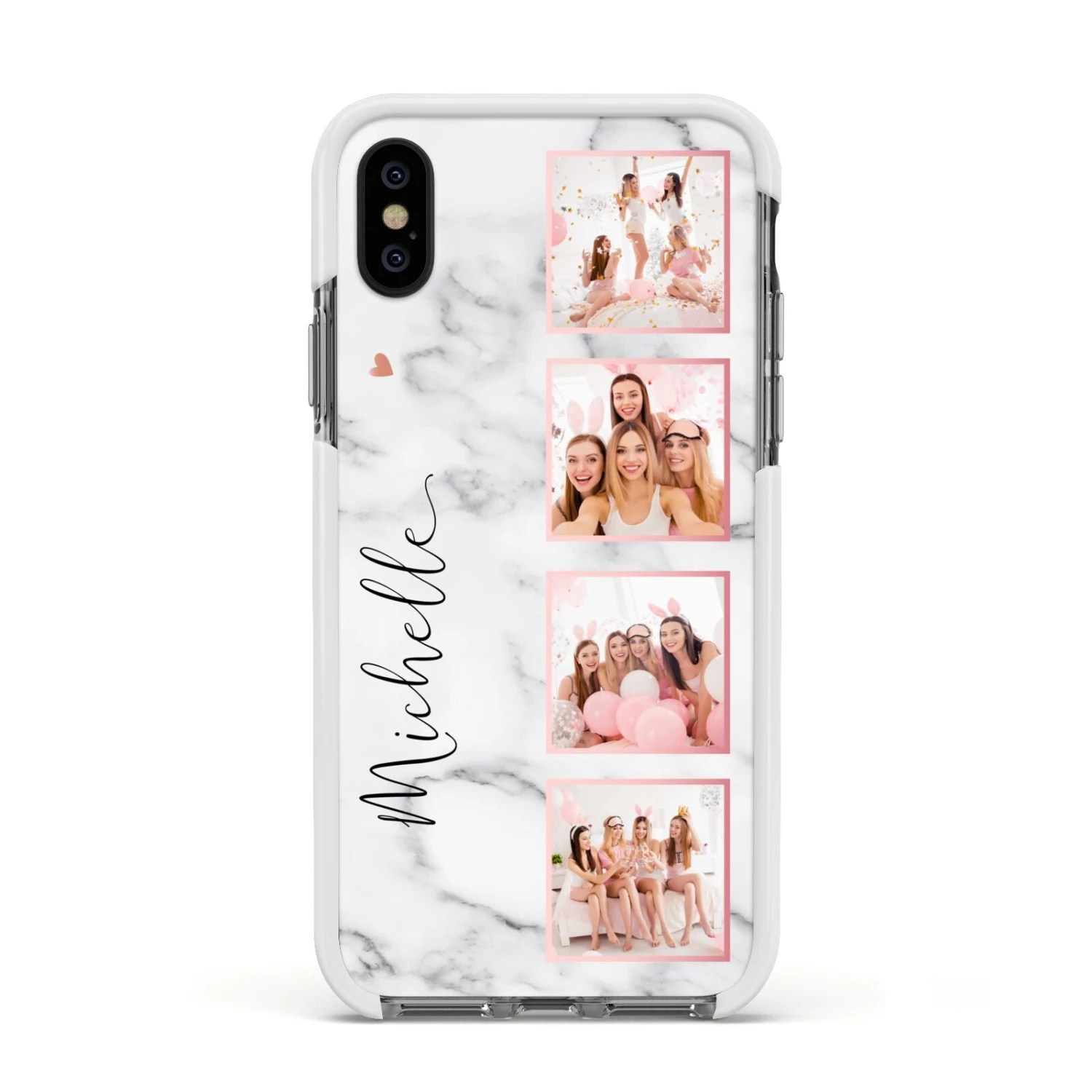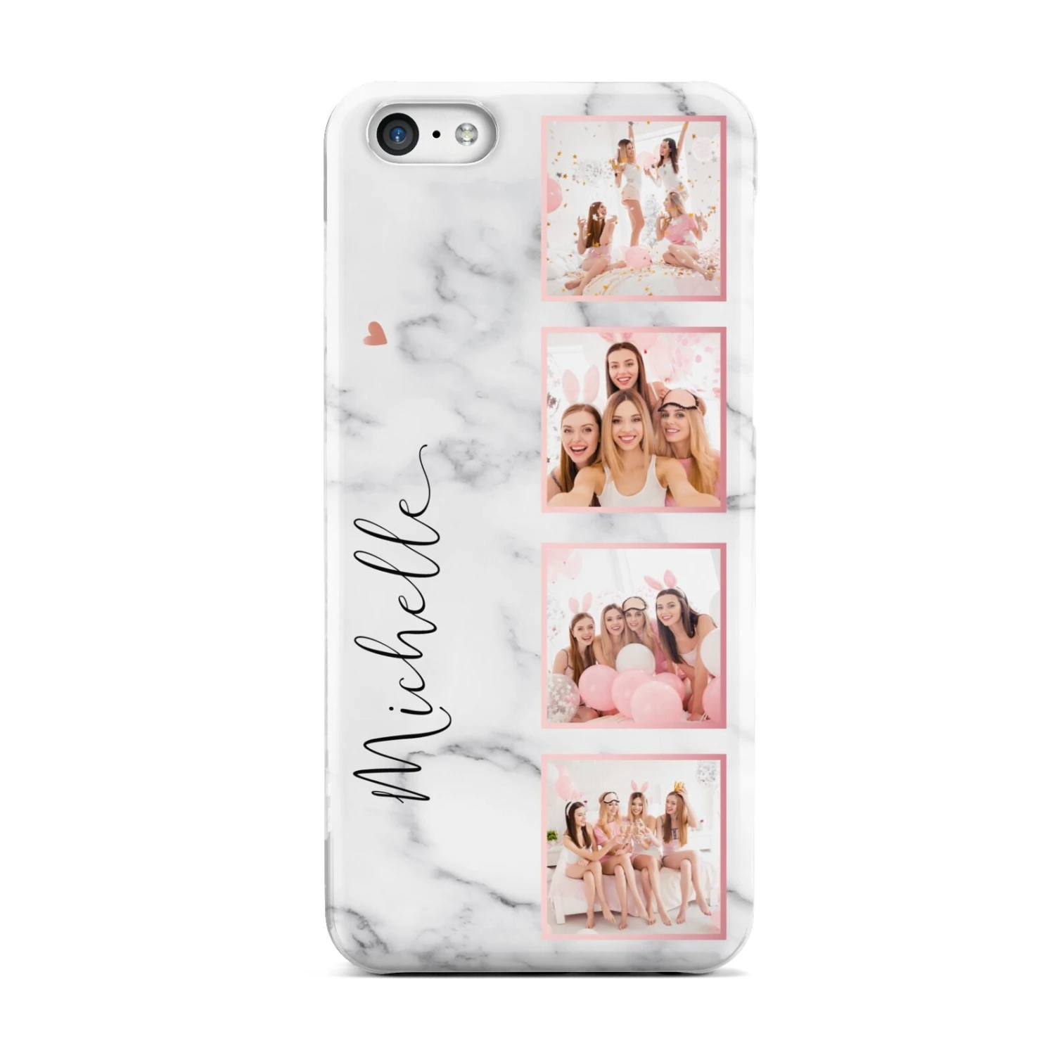 Our Marble Photo Strip Personalised Apple iPhone Case is a four photo upload design, set on a grey and white marble background. The photos are edged in a pink colour. The design also allows for a name to be added.