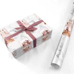 Our Marble Photo Strip Personalised Wrapping Paper is a four photo upload design, set on a grey and white marble background. The photos are edged in a pink colour. The design also allows for a name to be added.