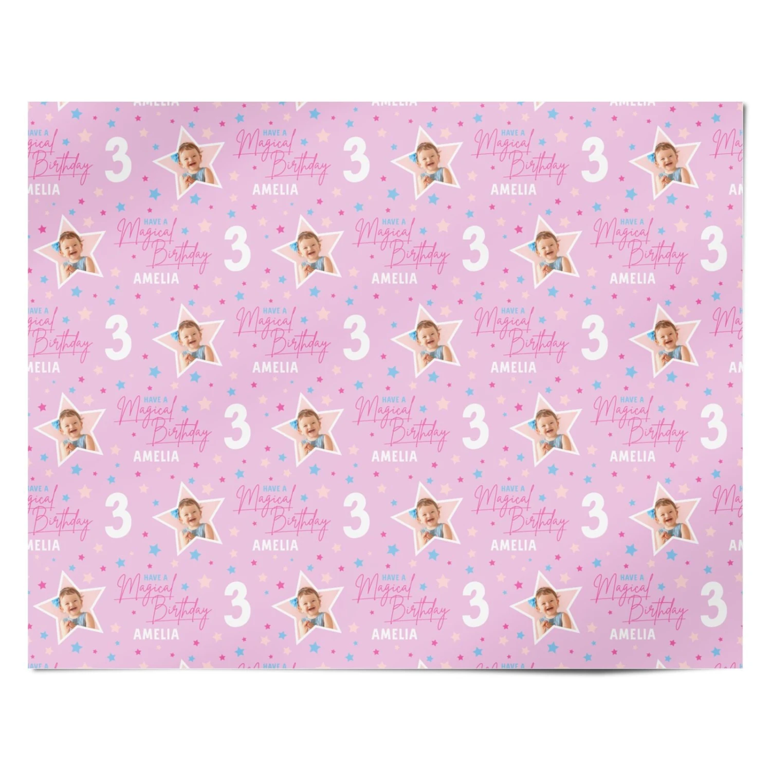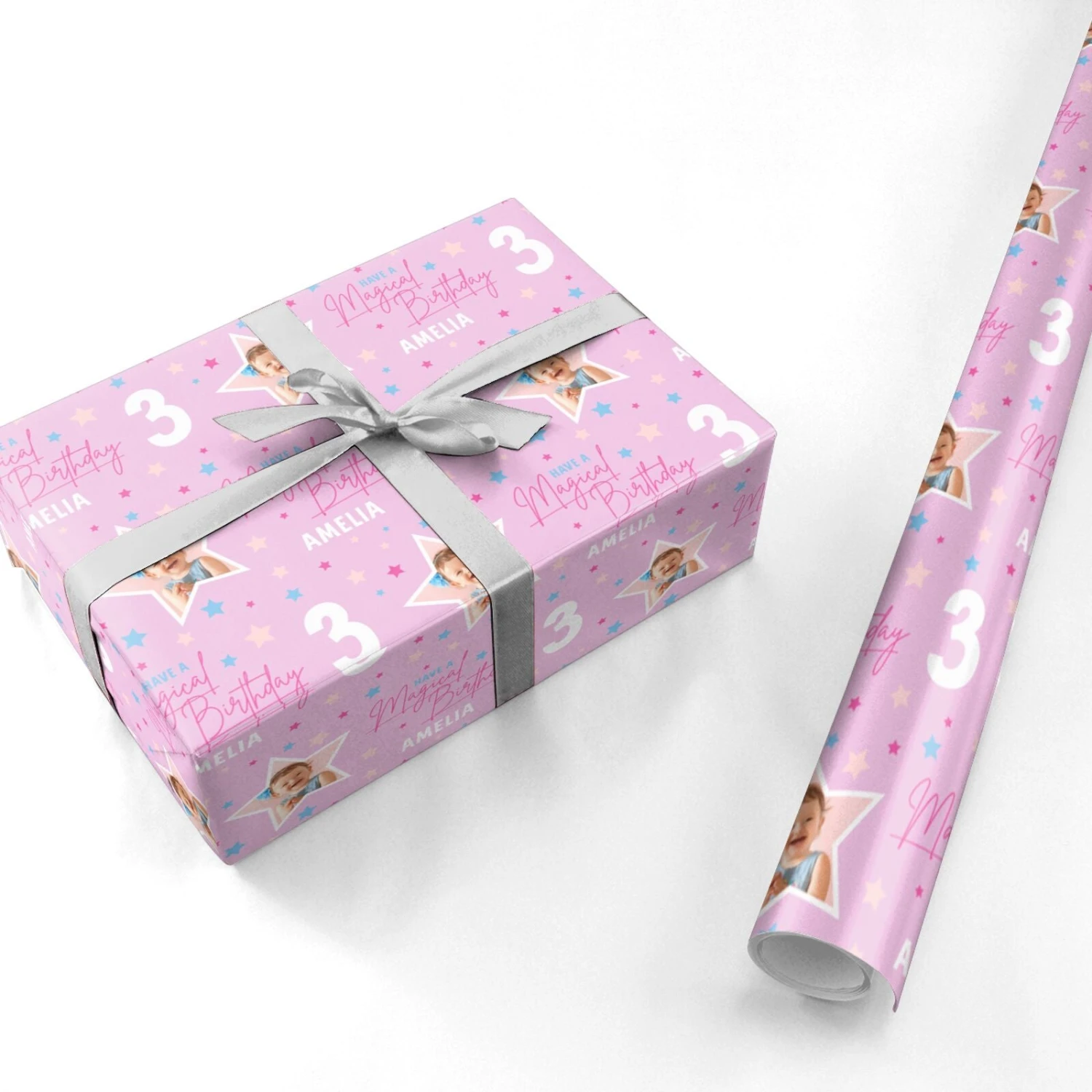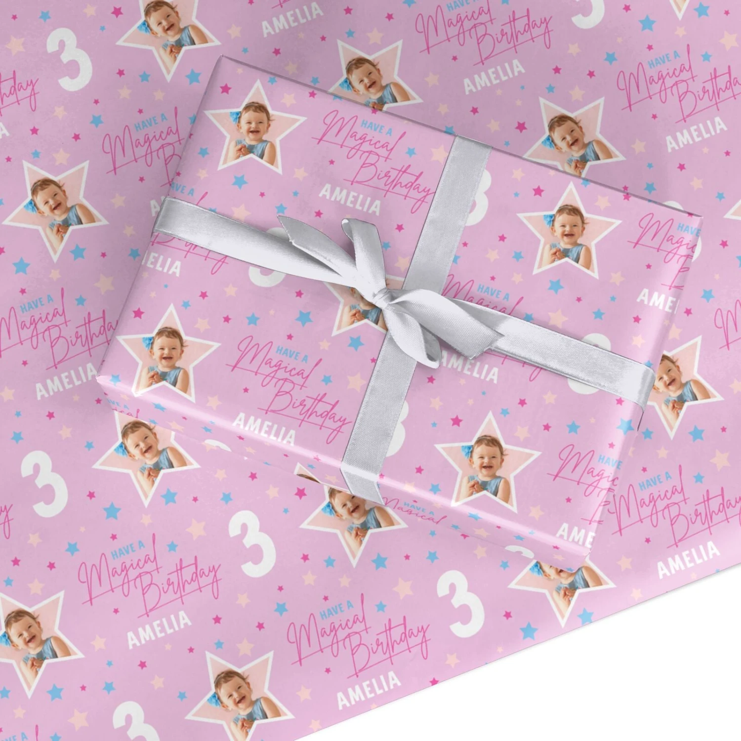 Our Personalised Girls Birthday Party Wrapping Paper is the perfect way to make a statement for any girls birthday party. The photo banner allows you to customise the name and age, and upload your favourite photo of your daughter. The design contains cute stars patterned on a pink background.
