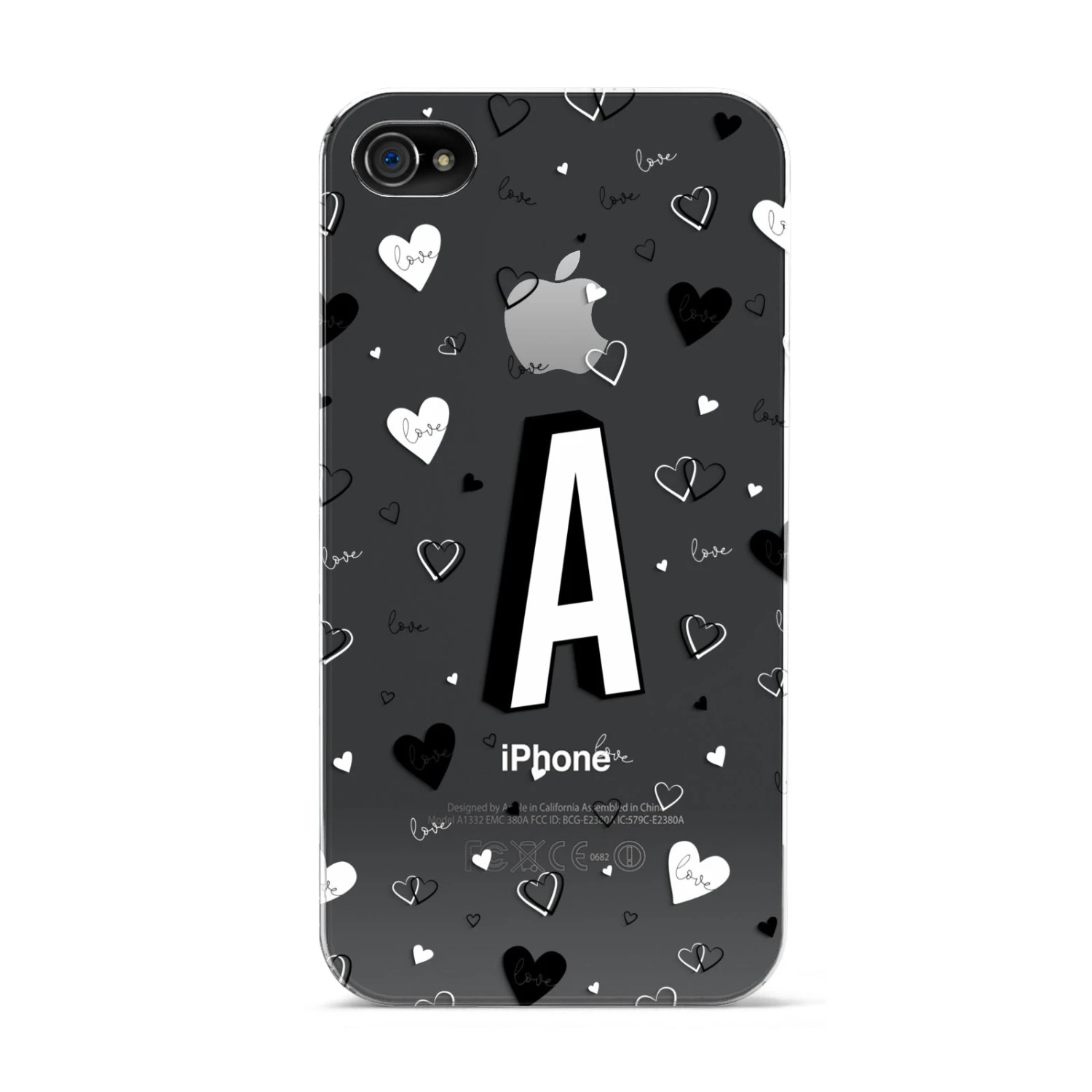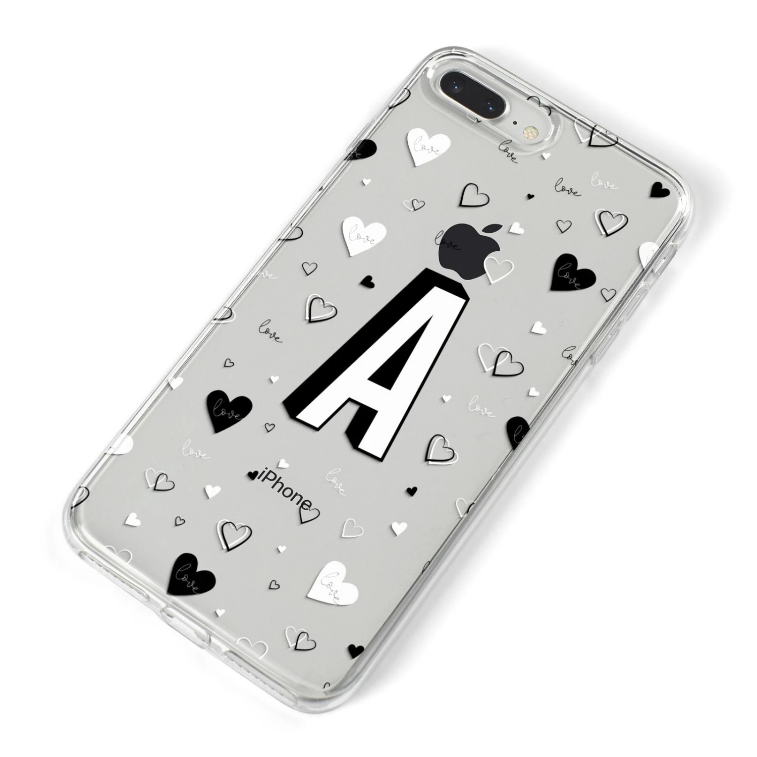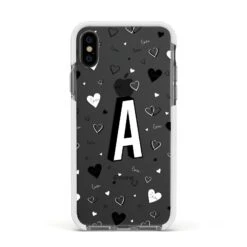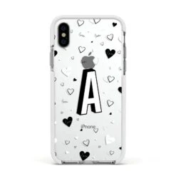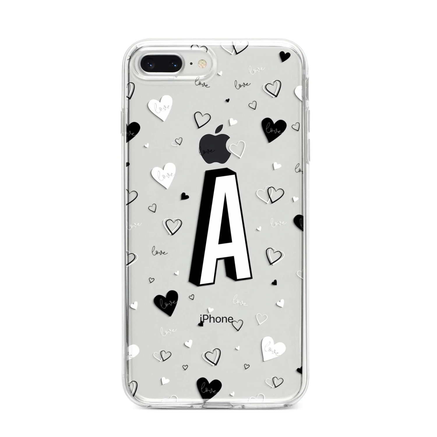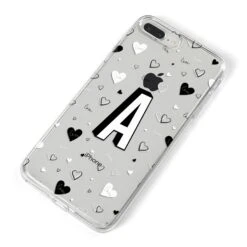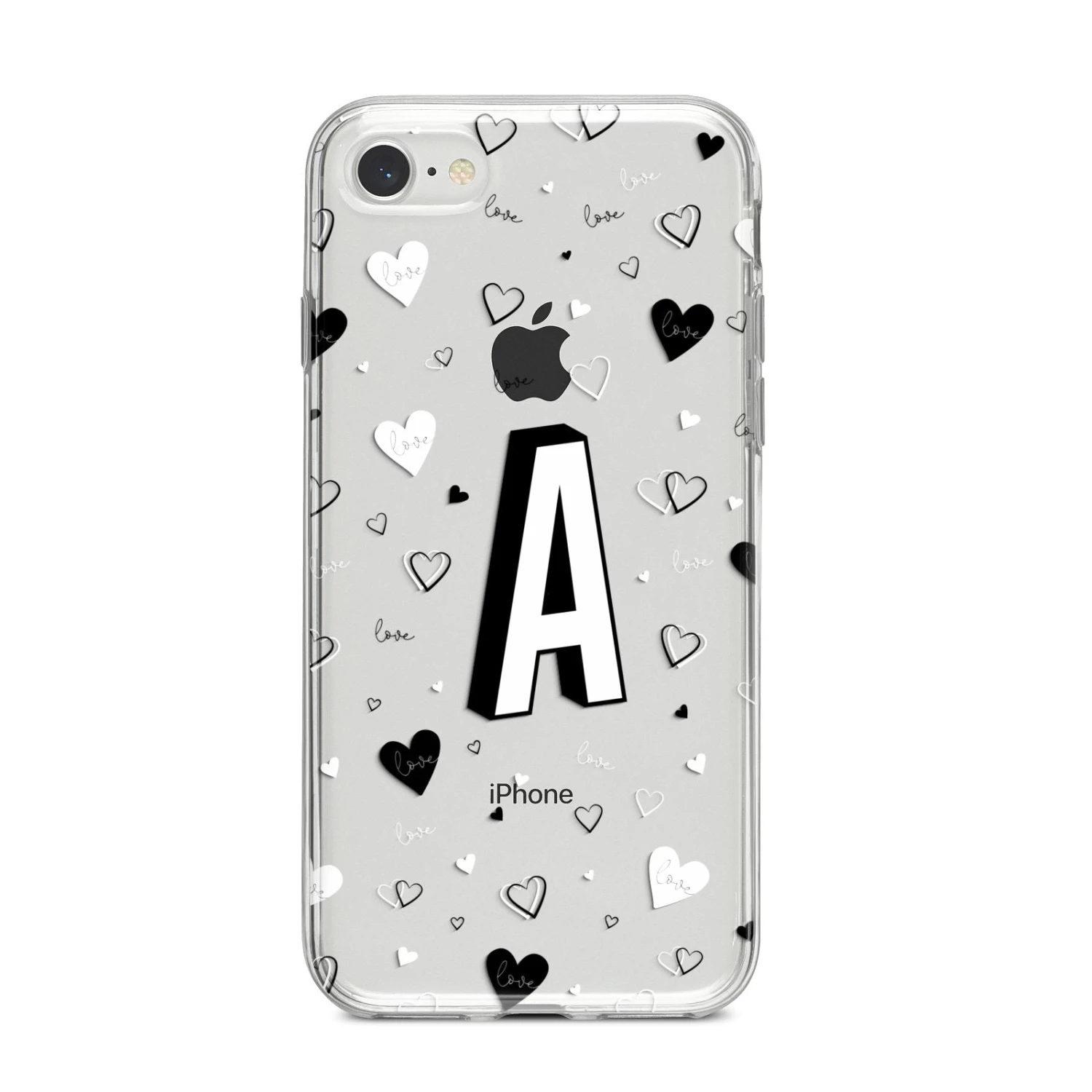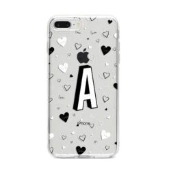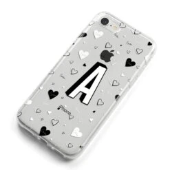 This Personalised Love Alphabet Apple iPhone Case is a transparent design, with white and black love hearts, and a drop shadow monogram. The perfect case for your BFF, or girlfriend, boyfriend or loved one.Â
