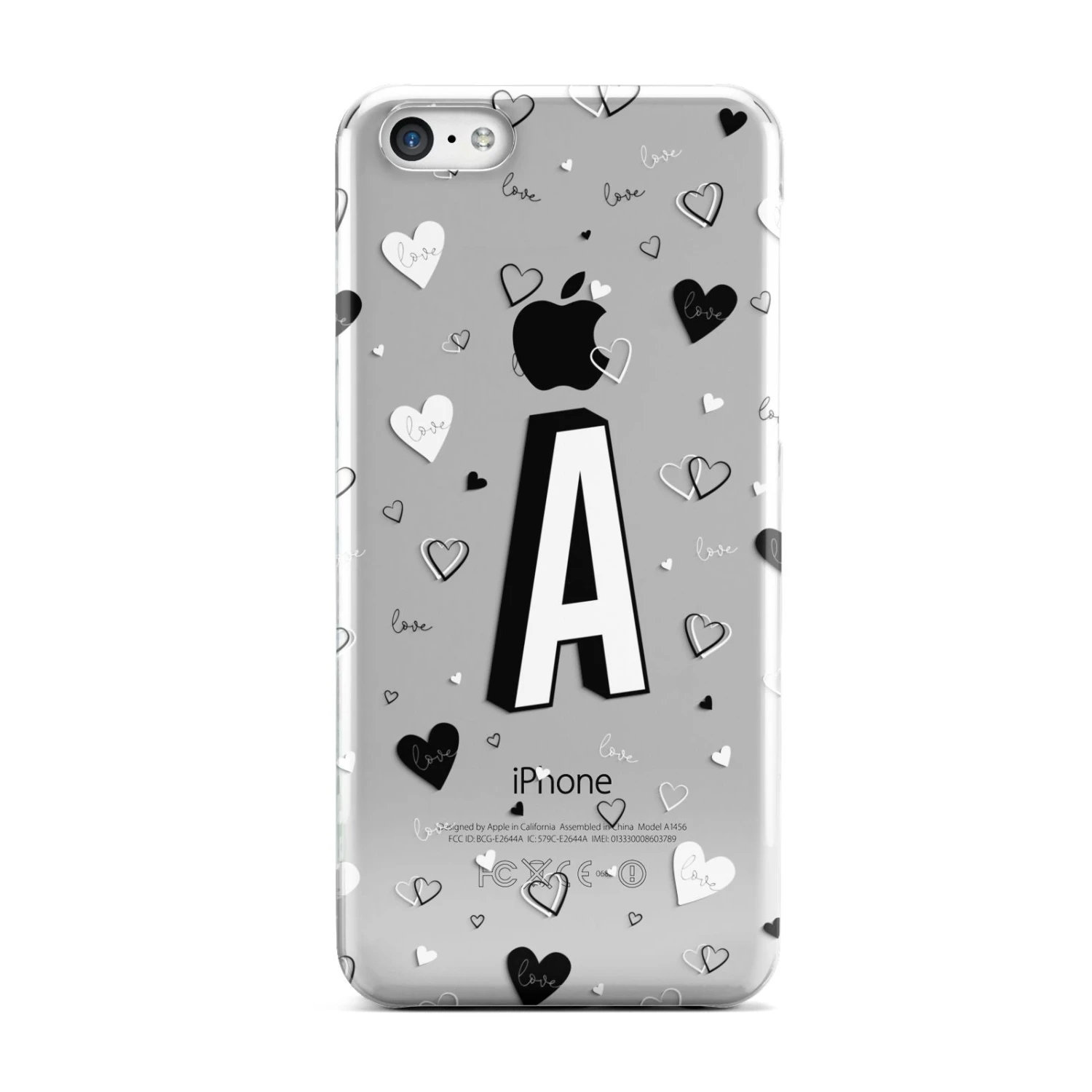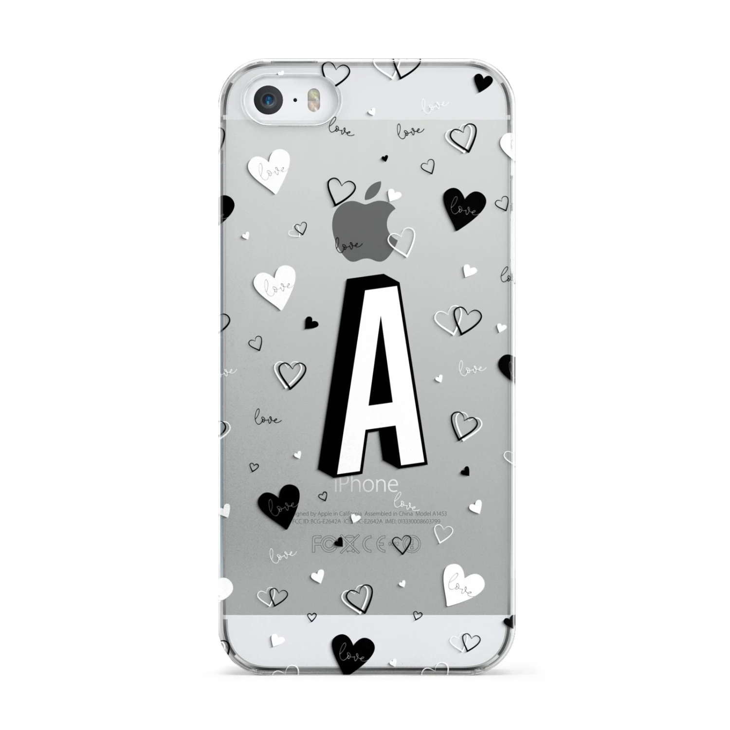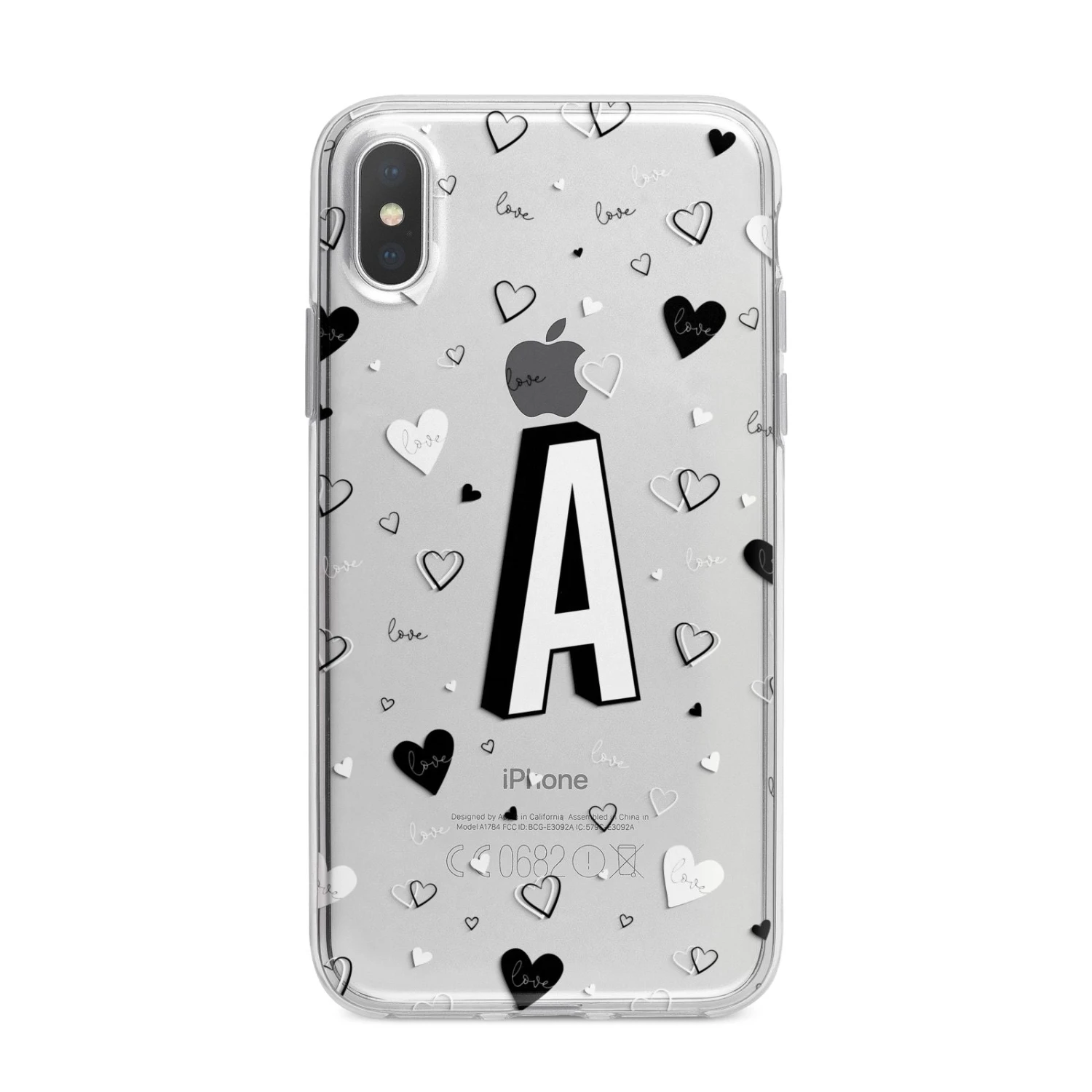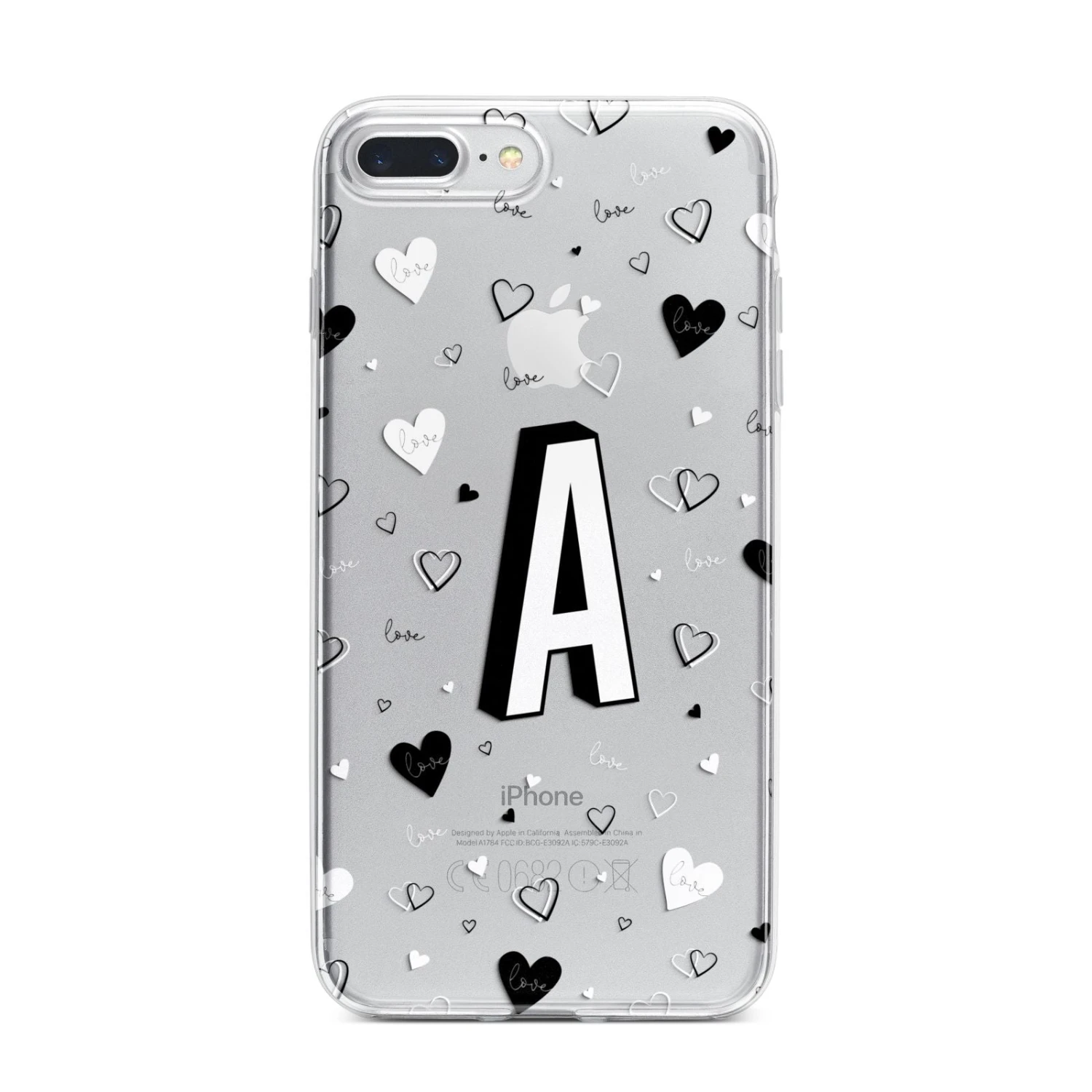This Personalised Love Alphabet Apple iPhone Case is a transparent design, with white and black love hearts, and a drop shadow monogram. The perfect case for your BFF, or girlfriend, boyfriend or loved one.Â