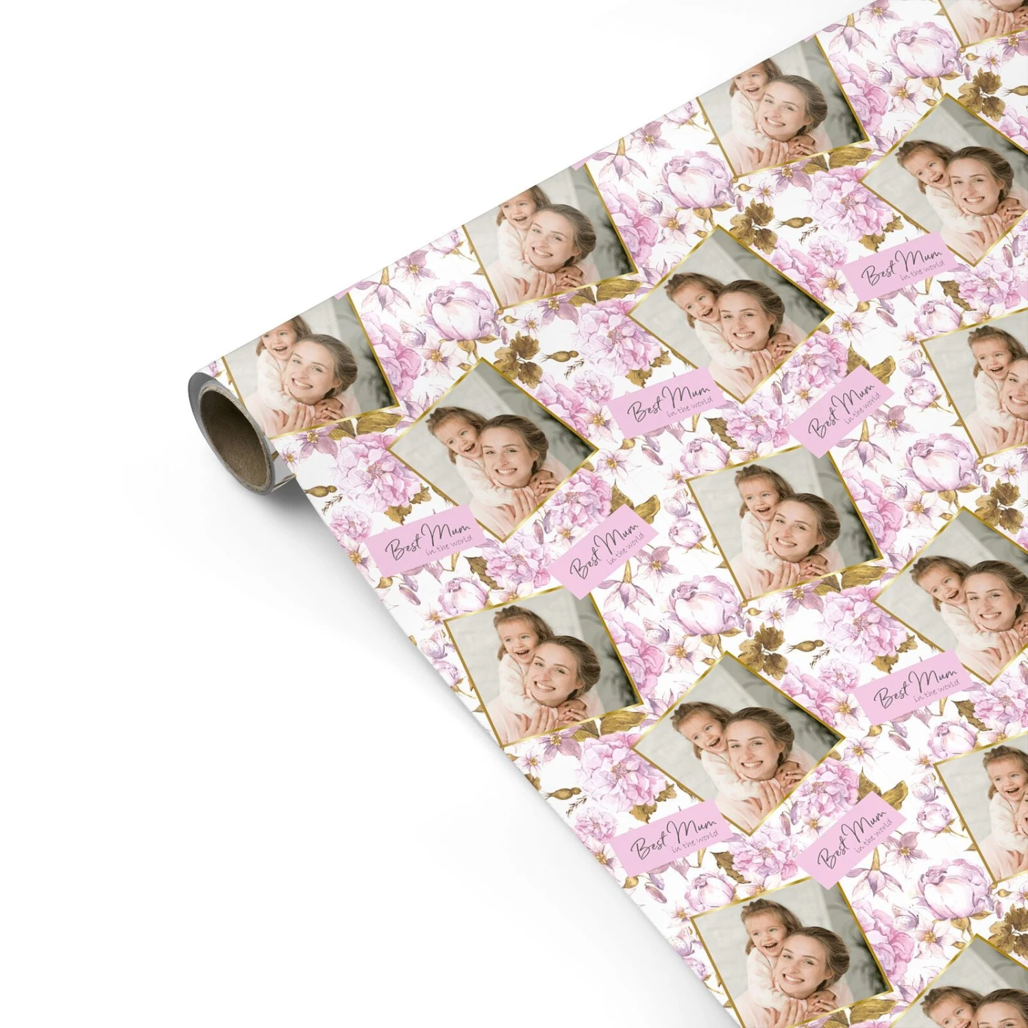 This chic, bespoke design is a wonderful way to thank your Mum for everything that she does for you. This heart-warming gift wrap design allows you to upload your Mum’s favourite family photo, then position it in the design to create your own customised present. Our Personalised Love You Mum Wrapping Paper will feature your image in a pink geometric background, which includes a plain pink block, gold ribbon, a pink watercolour floral illustration, and the text ‘Love You Mum’ just underneath the photo. Perfect for Mother’s Day.