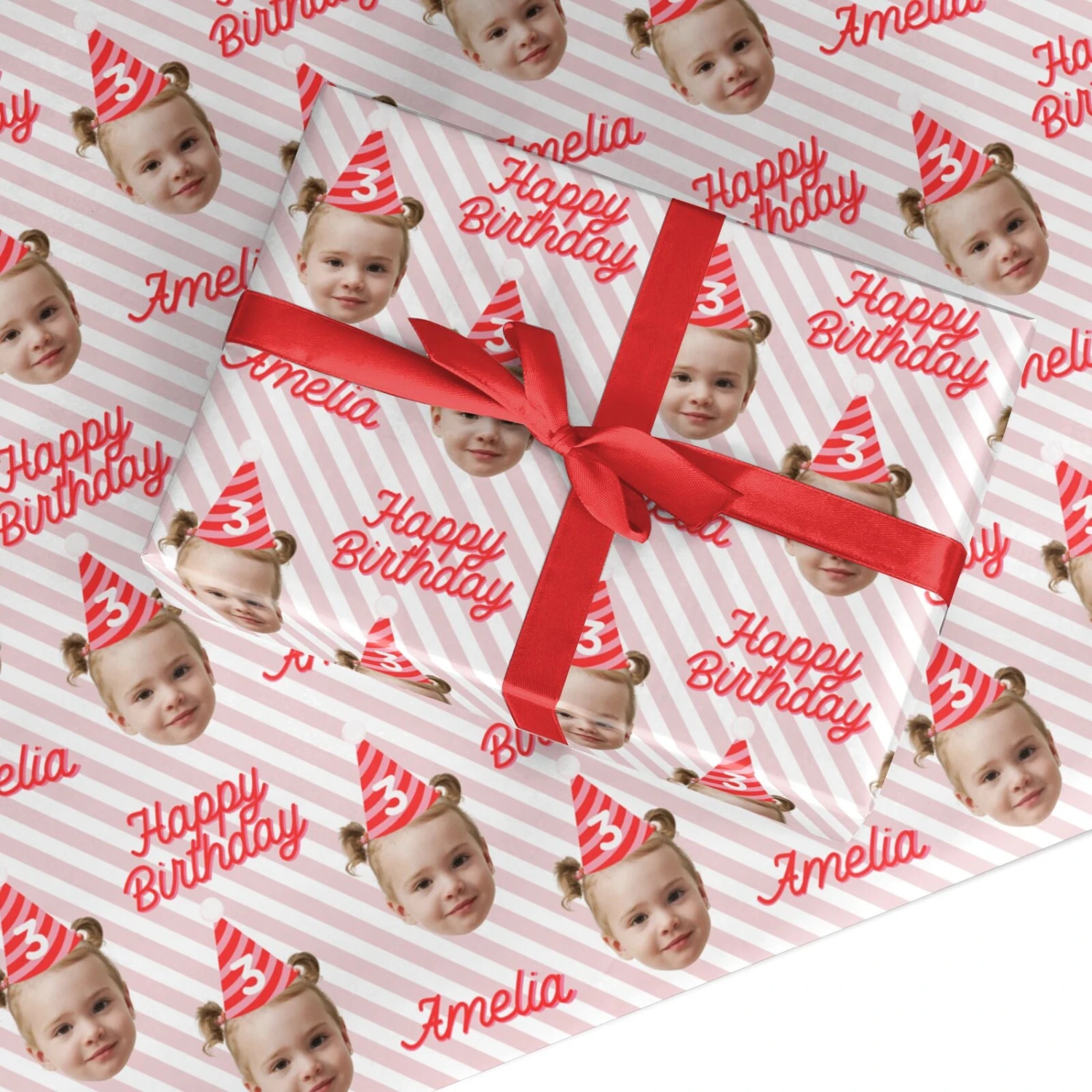 Introducing our Personalised Photo Birthday Party Hat wrapping paper. Customise this stylish Birthday design with an image of your choice and we take care of cropping the face out. Preview this stunning design instantly. Surprise the recipient with this beautiful unique wrapping paper and bring a smile to their face.