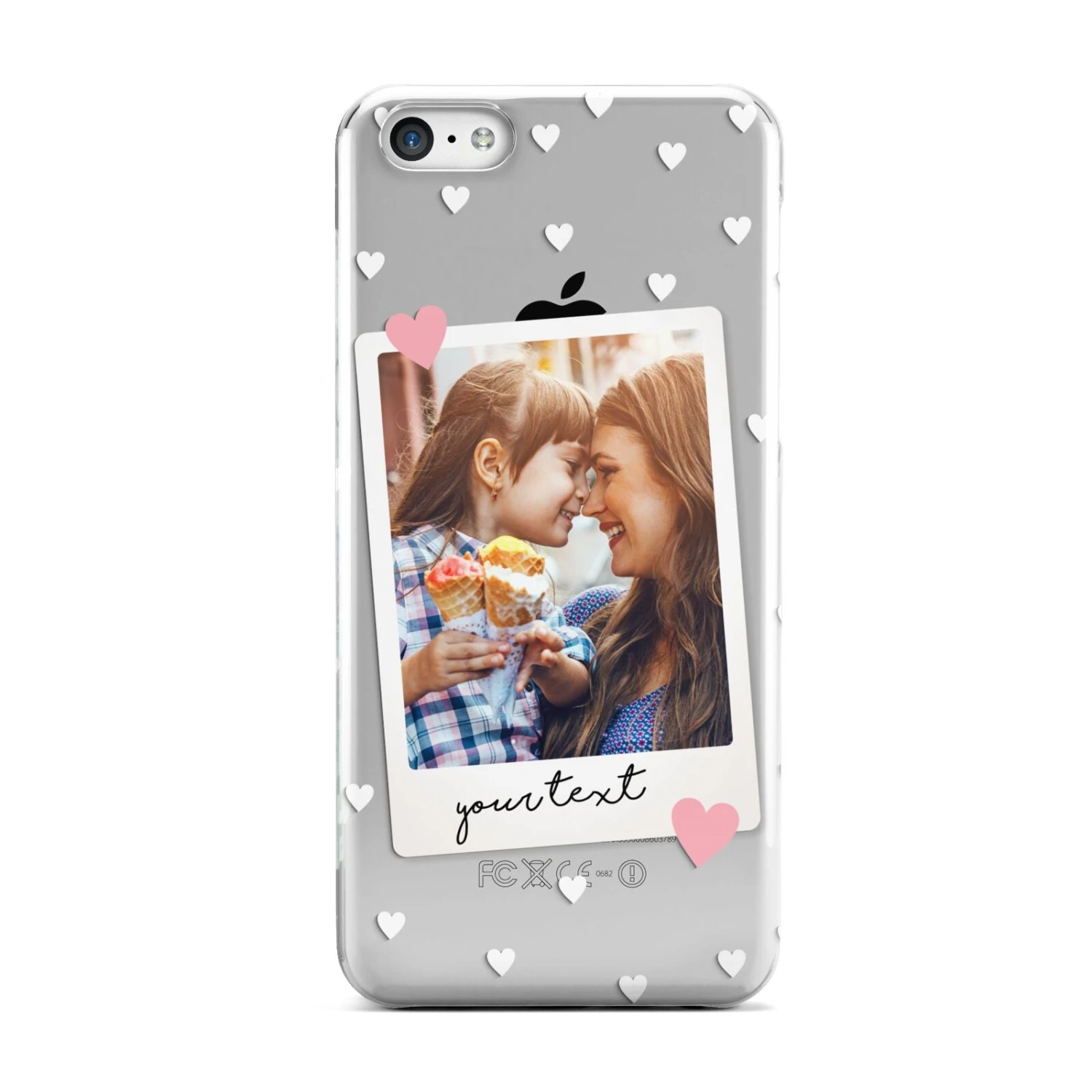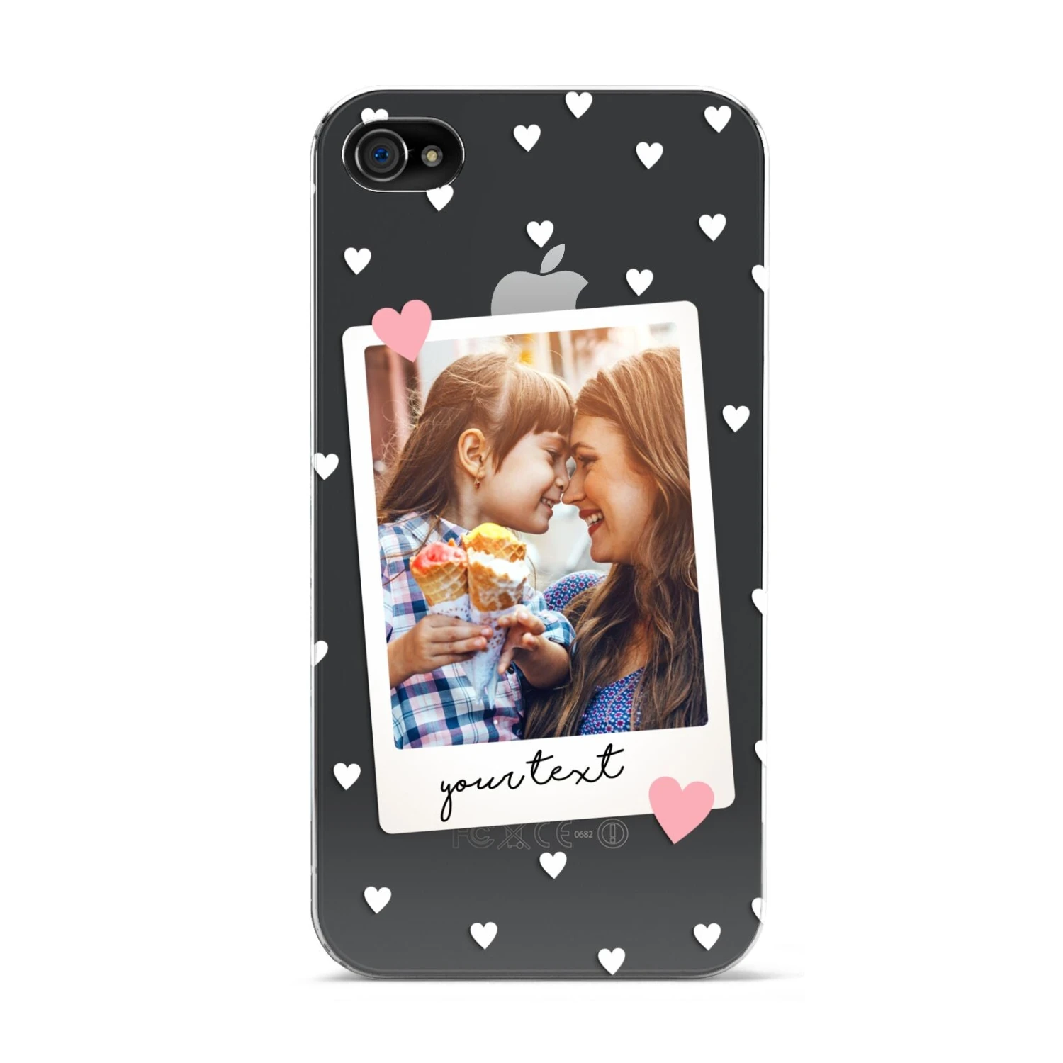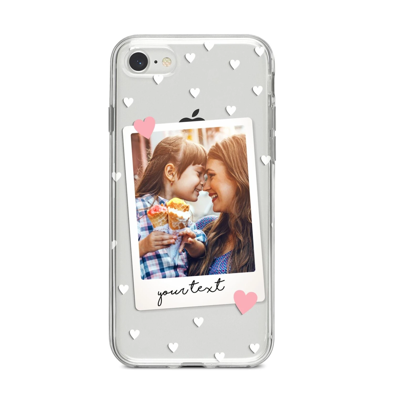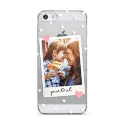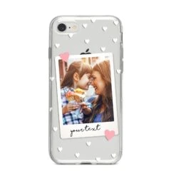 Our Personalised Photo Love Hearts Apple iPhone Case is a delightful design that’s perfect for Valentine’s Day or Mother’s Day or simply to show off your love for someone. The design contains both a photograph and text, which you can customise using our simple preview tool. Find your perfect photo, add some text, be it a name or a message, and your design will be created in a matter of seconds. The design features white love hearts, patterned against a transparent background. On our clear cases these background areas show the colour of your device for a dramatic effect. Your image is framed in an off-white border, and is set within two pink love hearts. The font is black in colour and uses our elegant handwritten font. If you’re looking for the perfect phone case to gift to someone special, such as your girlfriend or boyfriend, husband or wife, then look no further. These make ideal bridal shower gifts, for any bride to be, or even a newlywed for their honeymoon.