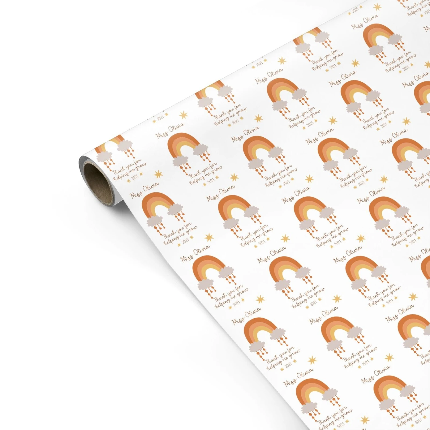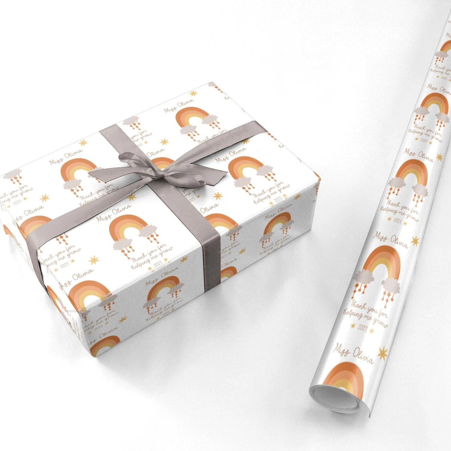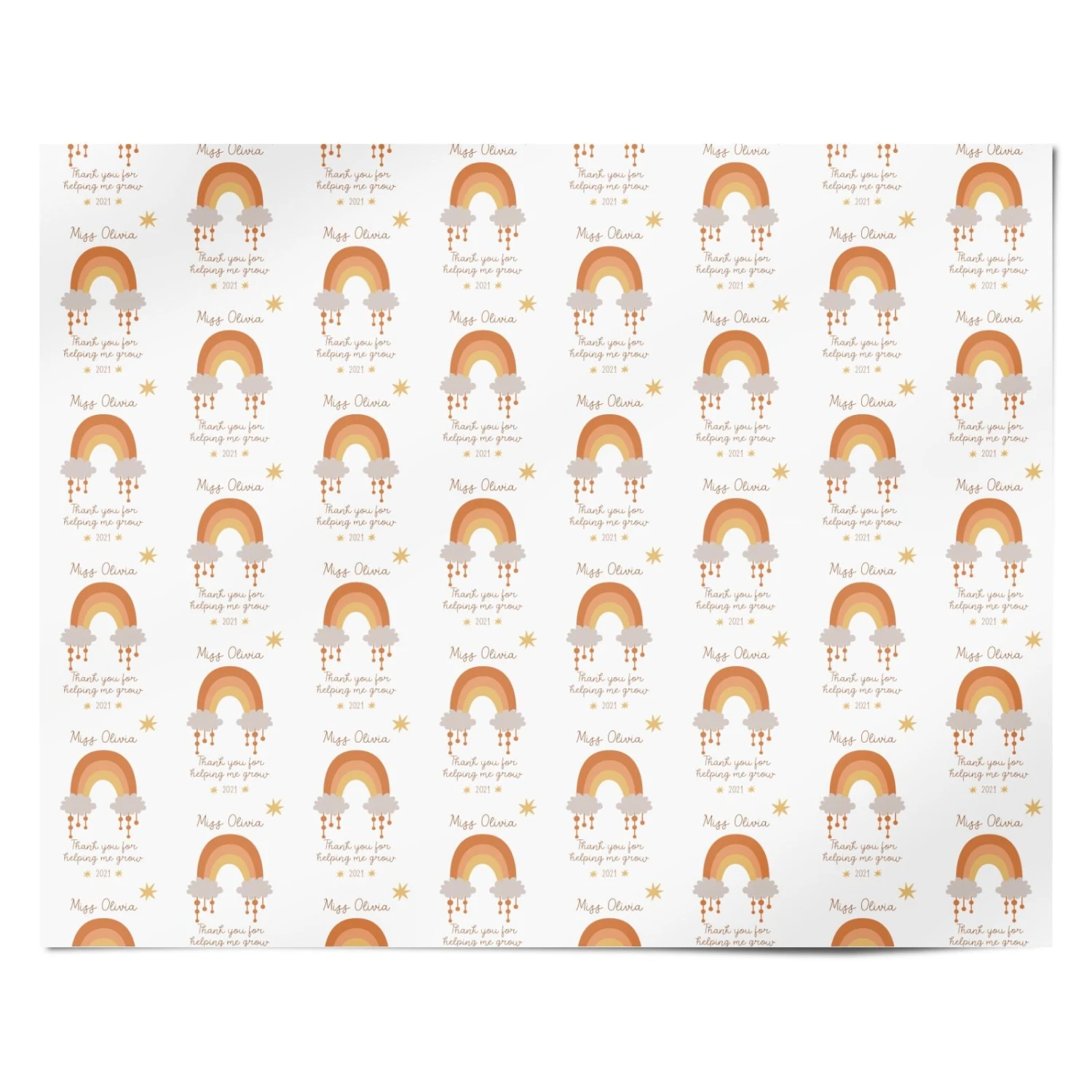 After a busy school year, this thoughtful teacher wrapping paper is the perfect way to say thank you. Our Personalised Thank You Teacher Neutral Rainbow Wrapping Paper is a bespoke teacher gift wrap, which is both stylish and sentimental. The design features a rainbow illustration, in a chic neutral colour palette. Underneath this, we’ve added the sweet message ‘Thank you for helping me grow’. Then, thanks to our customisation services, there is also the chance for you to add in your own text. You can add your teacher’s name, and the year into the design, to make the gift wrap one of a kind wrapping paper from a pupil.Â