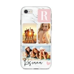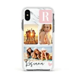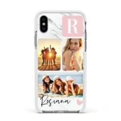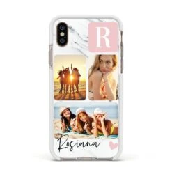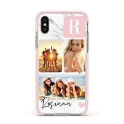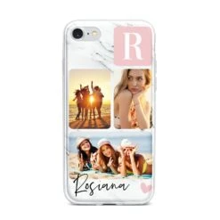 Trendy Personalised Three Photo Name Apple iPhone Case. This design features not one, but three fully customisable images! Simply upload your photos in the live cropping tool to easily arrange and crop them. Each has rounded edges to match the gorgeous, blush pink initial box, which is also personalised to whichever initial you would like. The initial is in a bold white font, to really make your phone stand out, no matter where you are. The design is on a classy marble background, and also features two blush pink hearts to add a dash of girly to the equation! You can fully customise the cursive, black text to a name of your choosing.