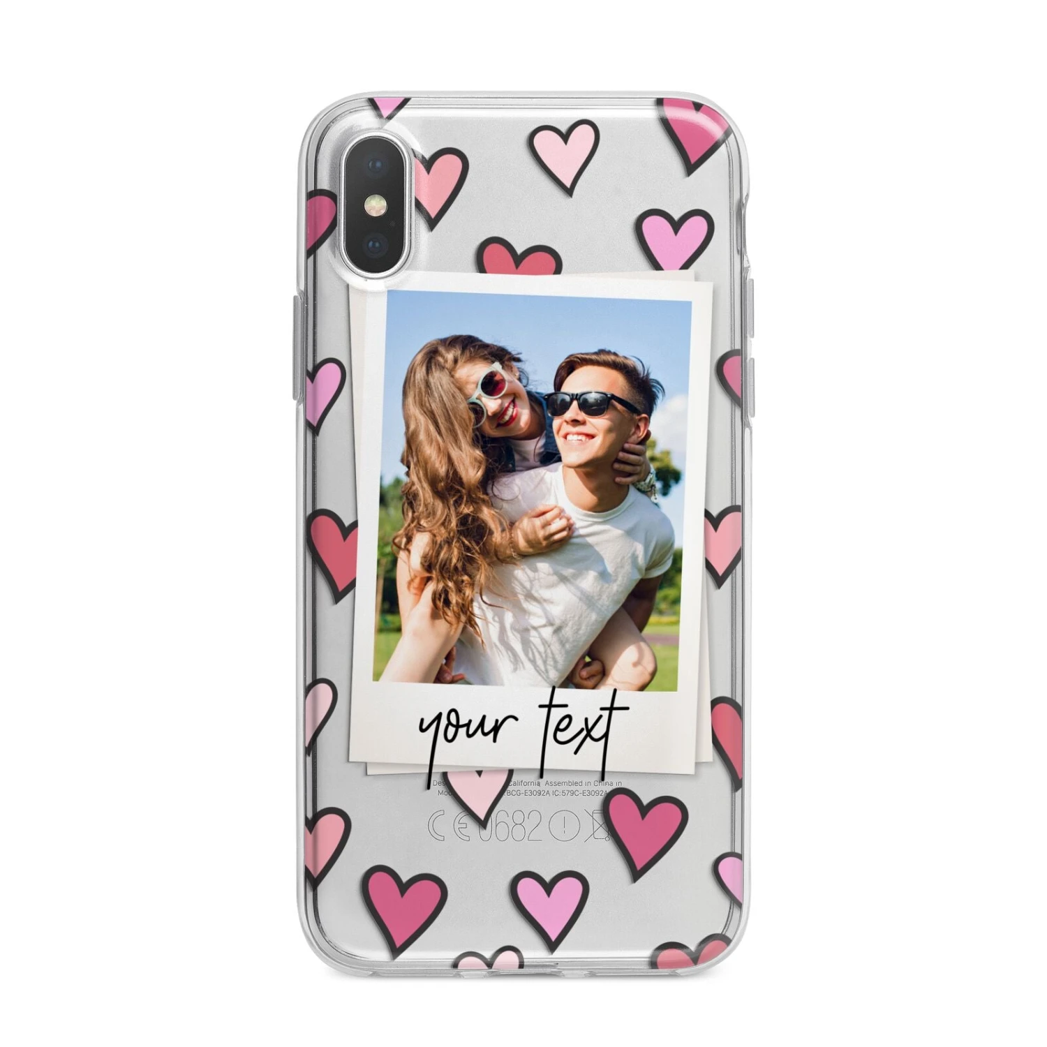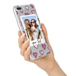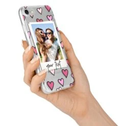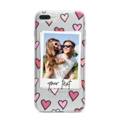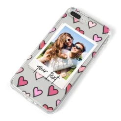 Our Personalised Valentine’s Day Photo Apple iPhone Case is the perfect gift for your special Valentine. Featuring a framed photo and handwritten message, you can customise this design with a picture of your boyfriend, girlfriend, wife or husband. The design features pink hand-drawn hearts, set on a transparent background. The transparency allows for your device to show through, when printed onto one of our clear cases, but will take on the base colour of the item when printed onto our other products. Upload your image into our easy to use tool, add some text and your design will be created with a preview, in seconds. Your chosen photo will be bordered in the white frame shown.Â