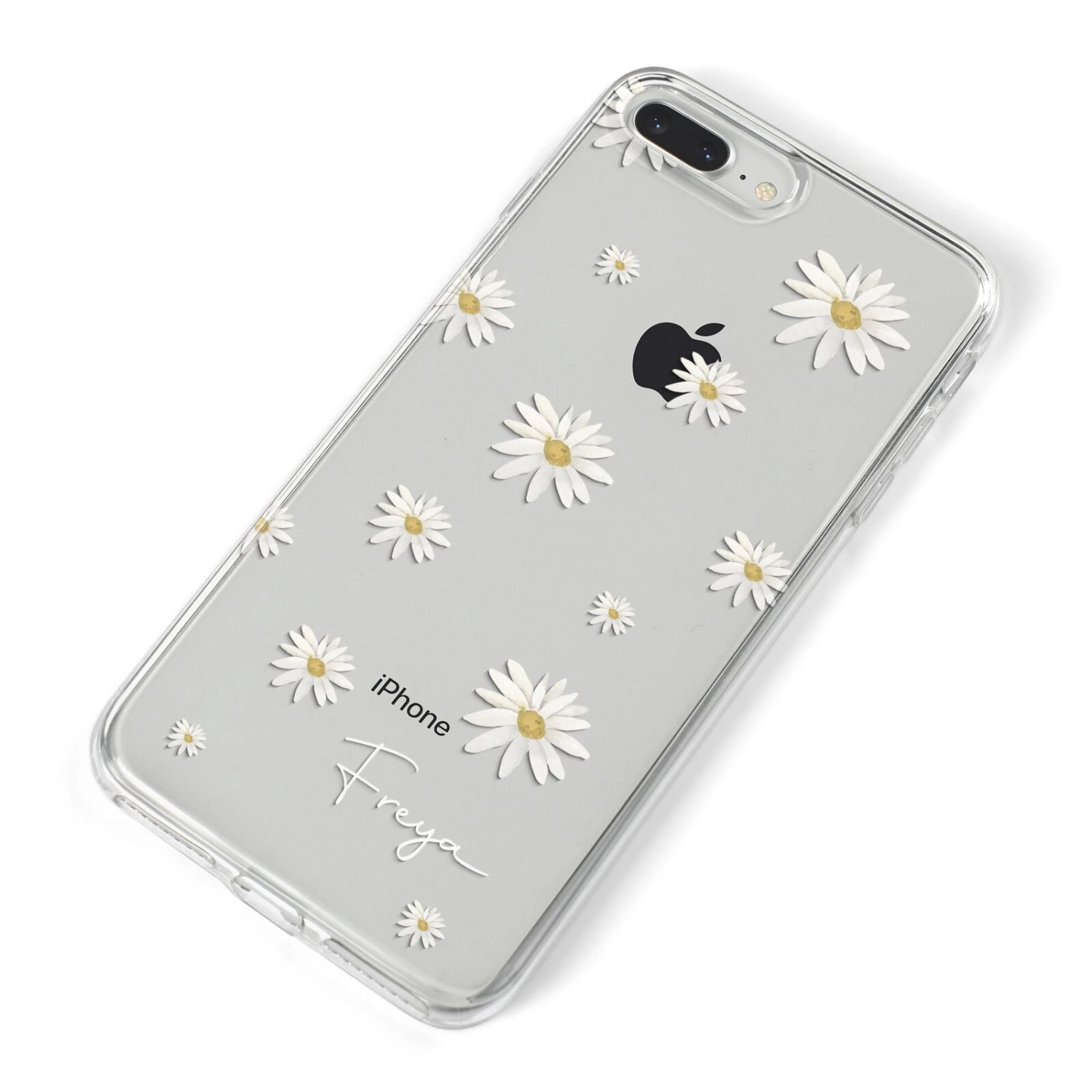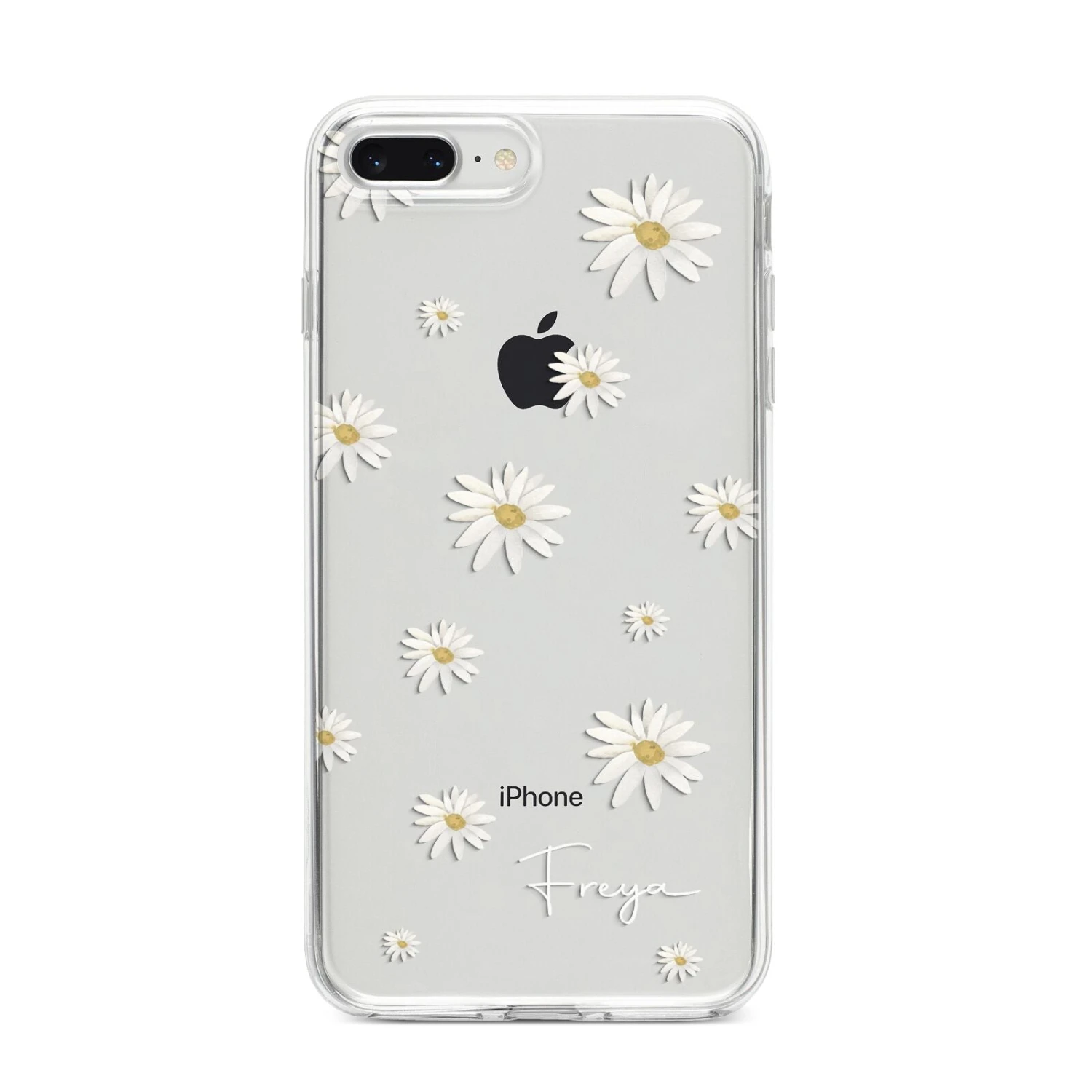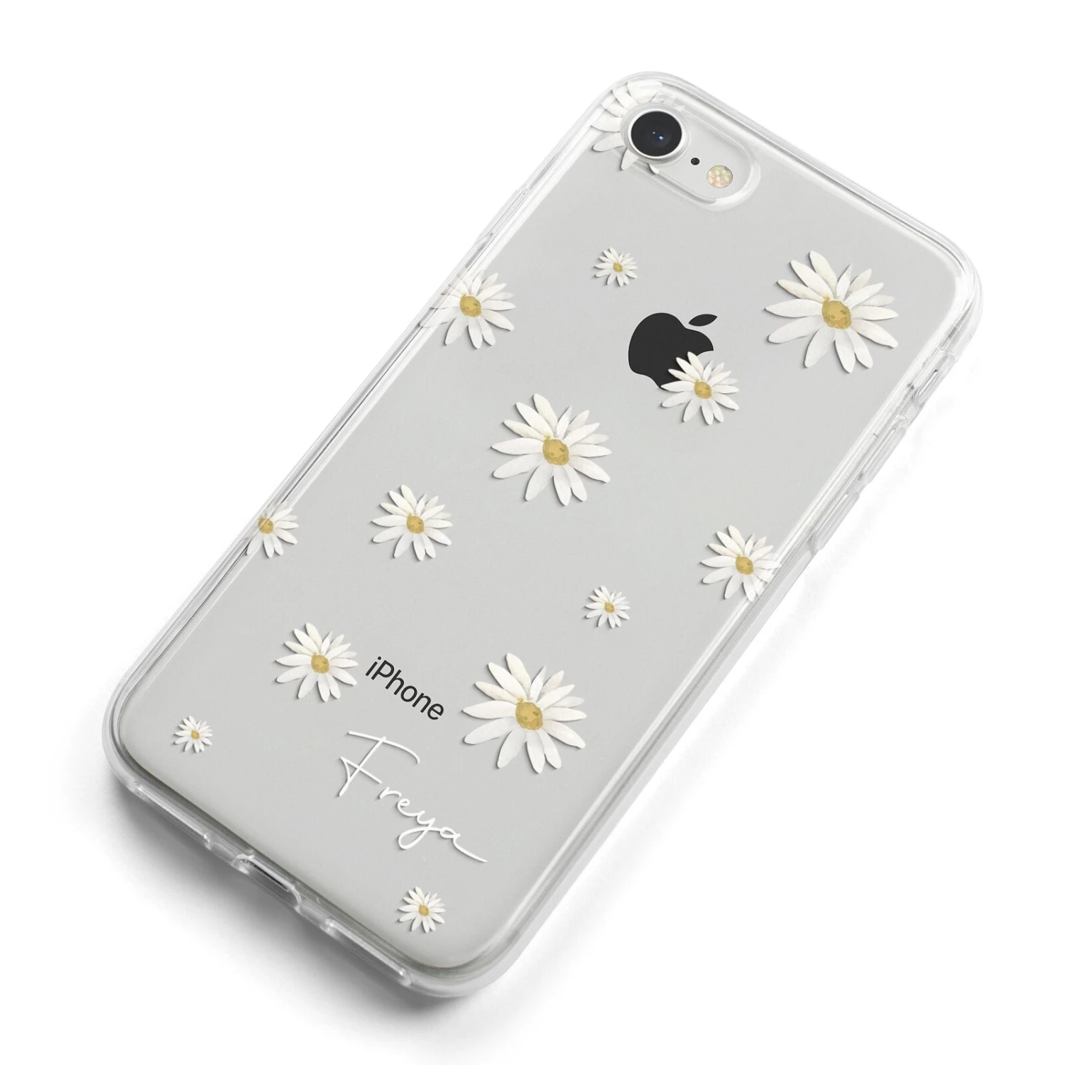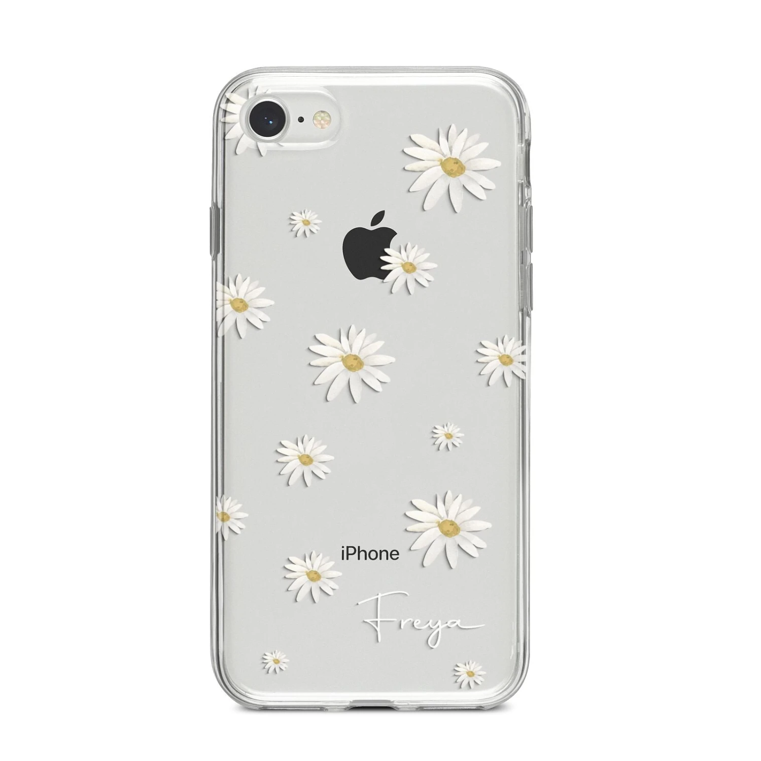Our Personalised Vintage Daisy Apple iPhone Case is set on a transparent background with a custom name. Add any name you like and we will print it in our handwritten font.