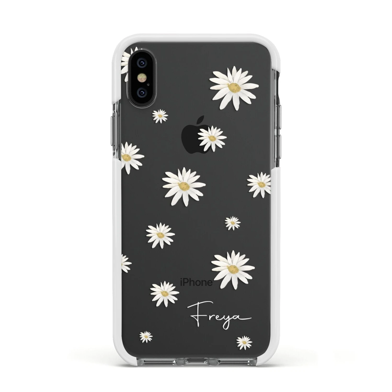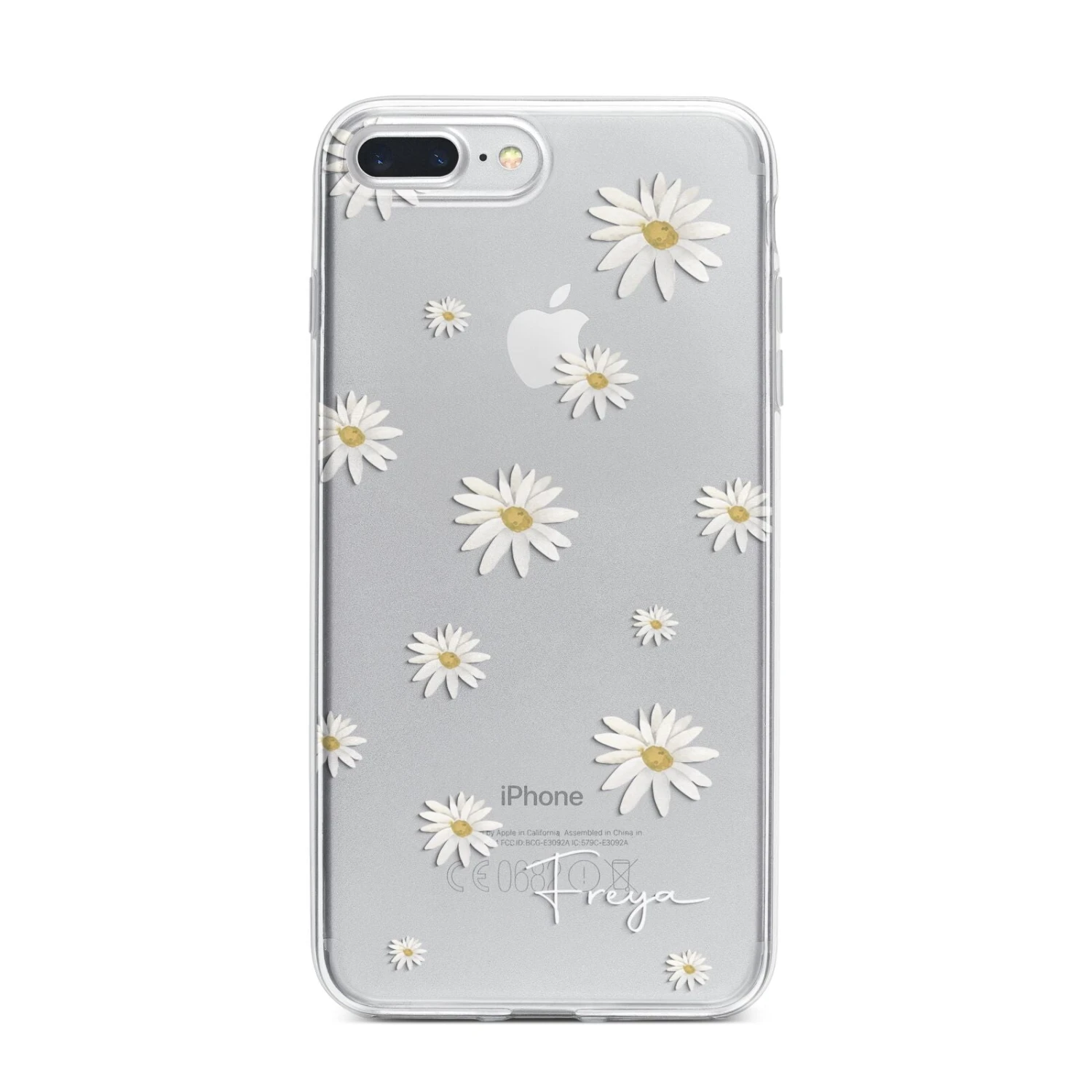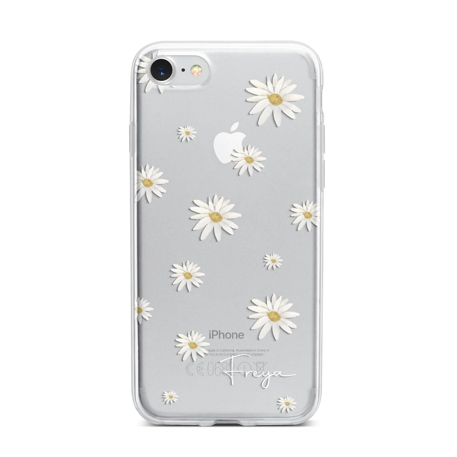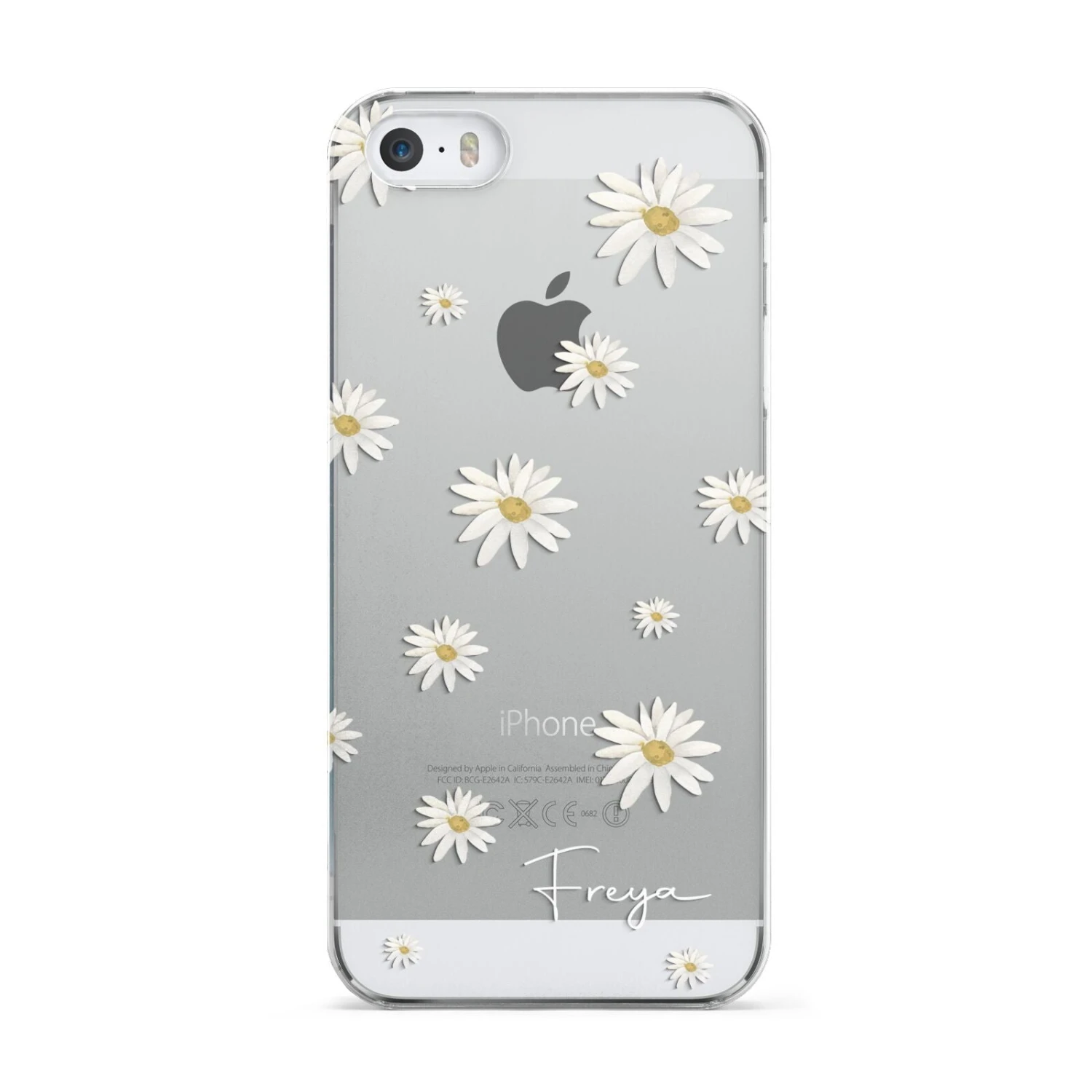 Our Personalised Vintage Daisy Apple iPhone Case is set on a transparent background with a custom name. Add any name you like and we will print it in our handwritten font.