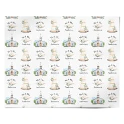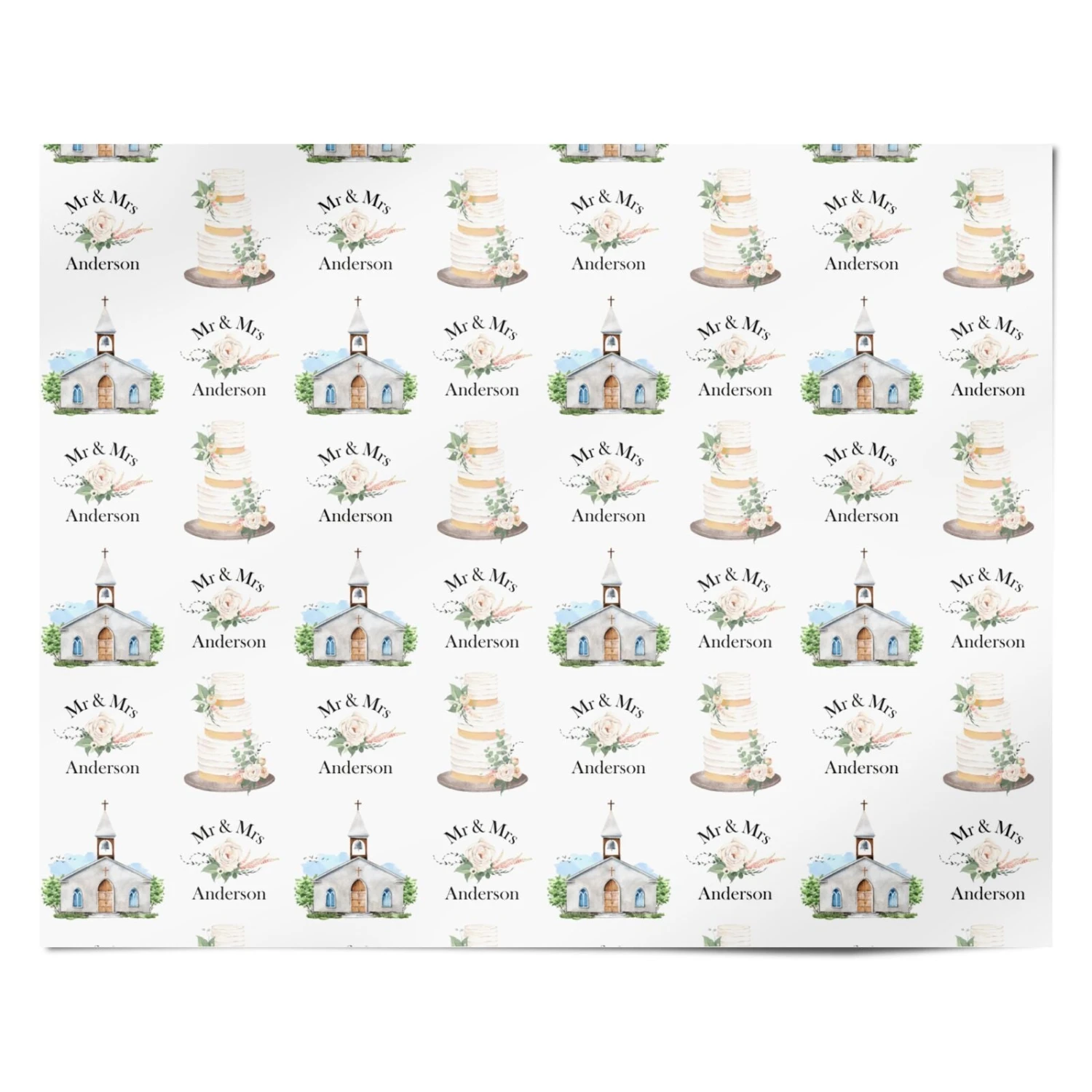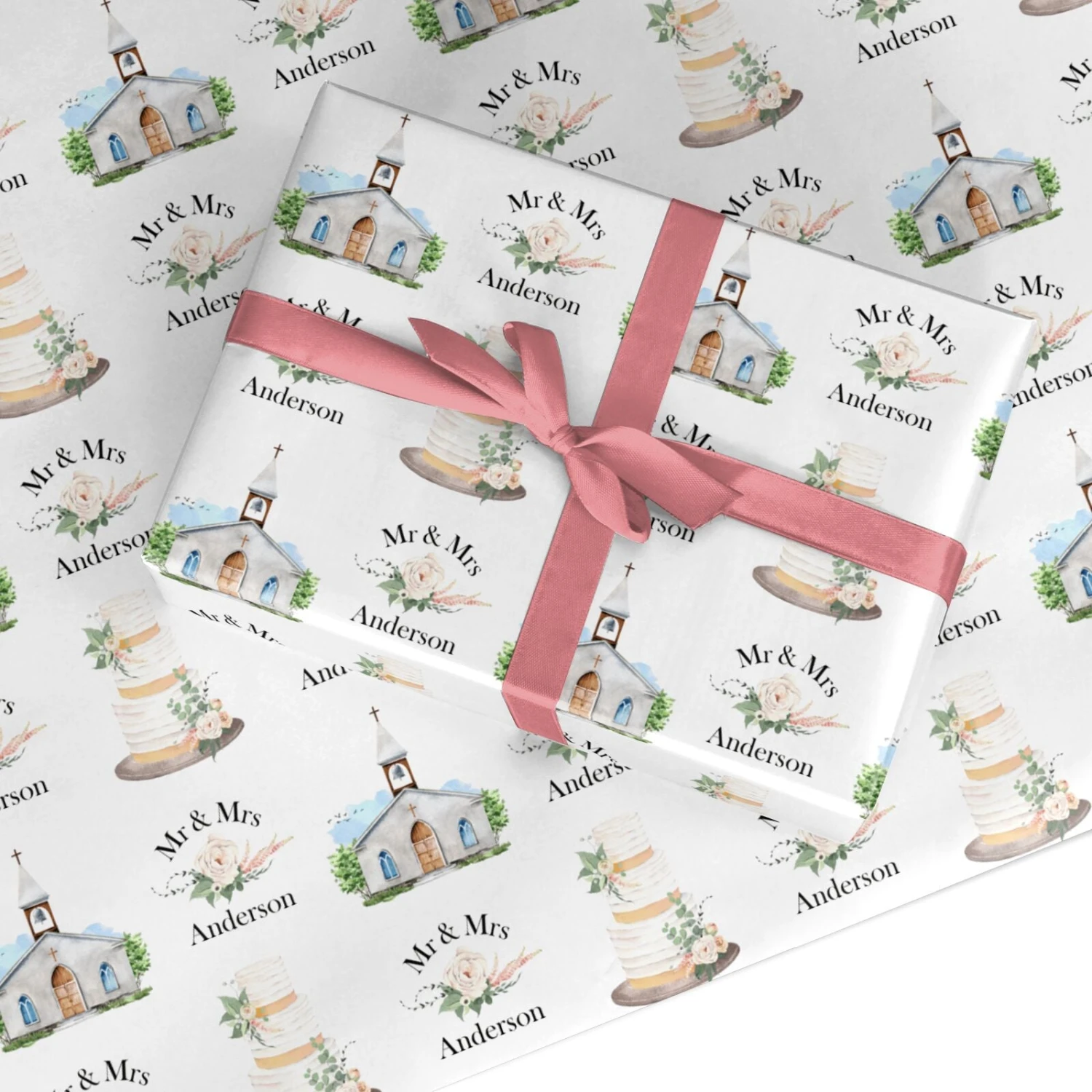Celebrate the newlyweds in style with this personalised wedding wrapping paper, featuring the couple’s surname for a truly unique touch. This elegant design showcases a charming pattern of wedding-themed elements, including a beautifully illustrated church, a delicate floral arrangement, and a tiered wedding cake decorated with lush greenery and soft blush roses.