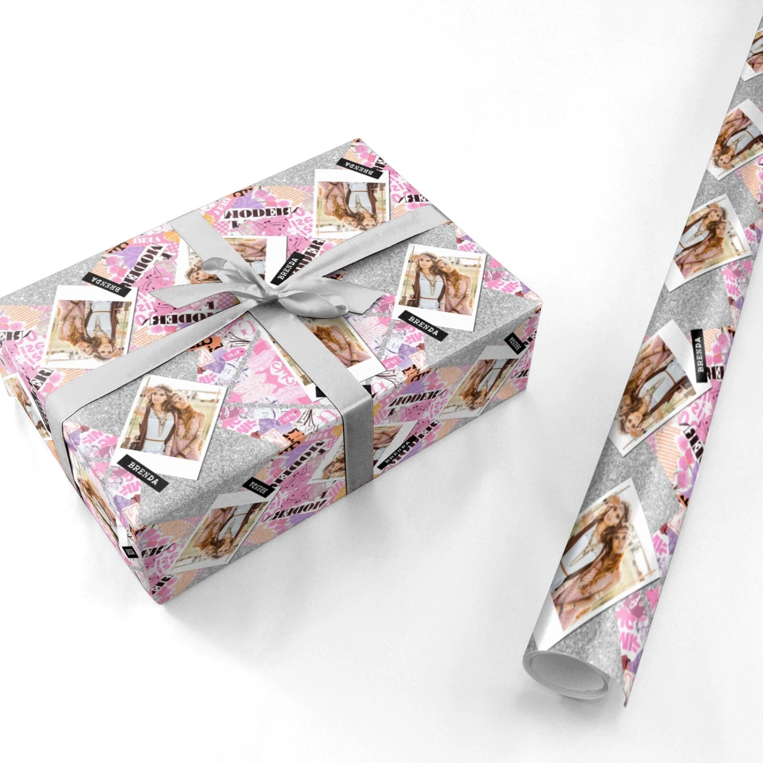 Our Picture Collage with Custom Photo Wrapping Paper is an aesthetic design with an abstract pink collage, with the ability to upload your own photograph and add a name or text. Perfect for the festival season.