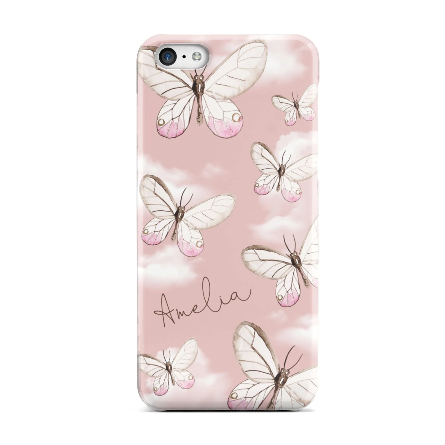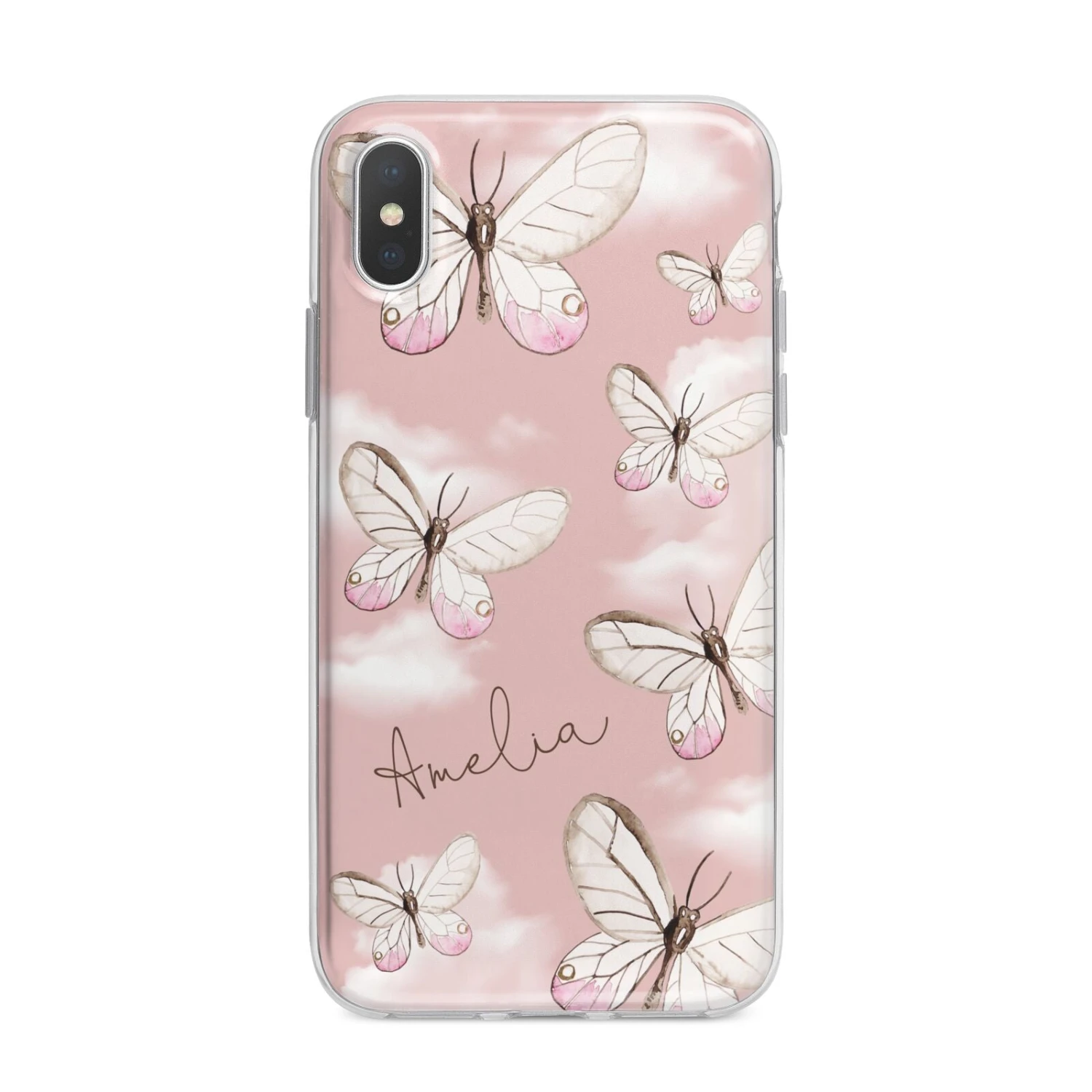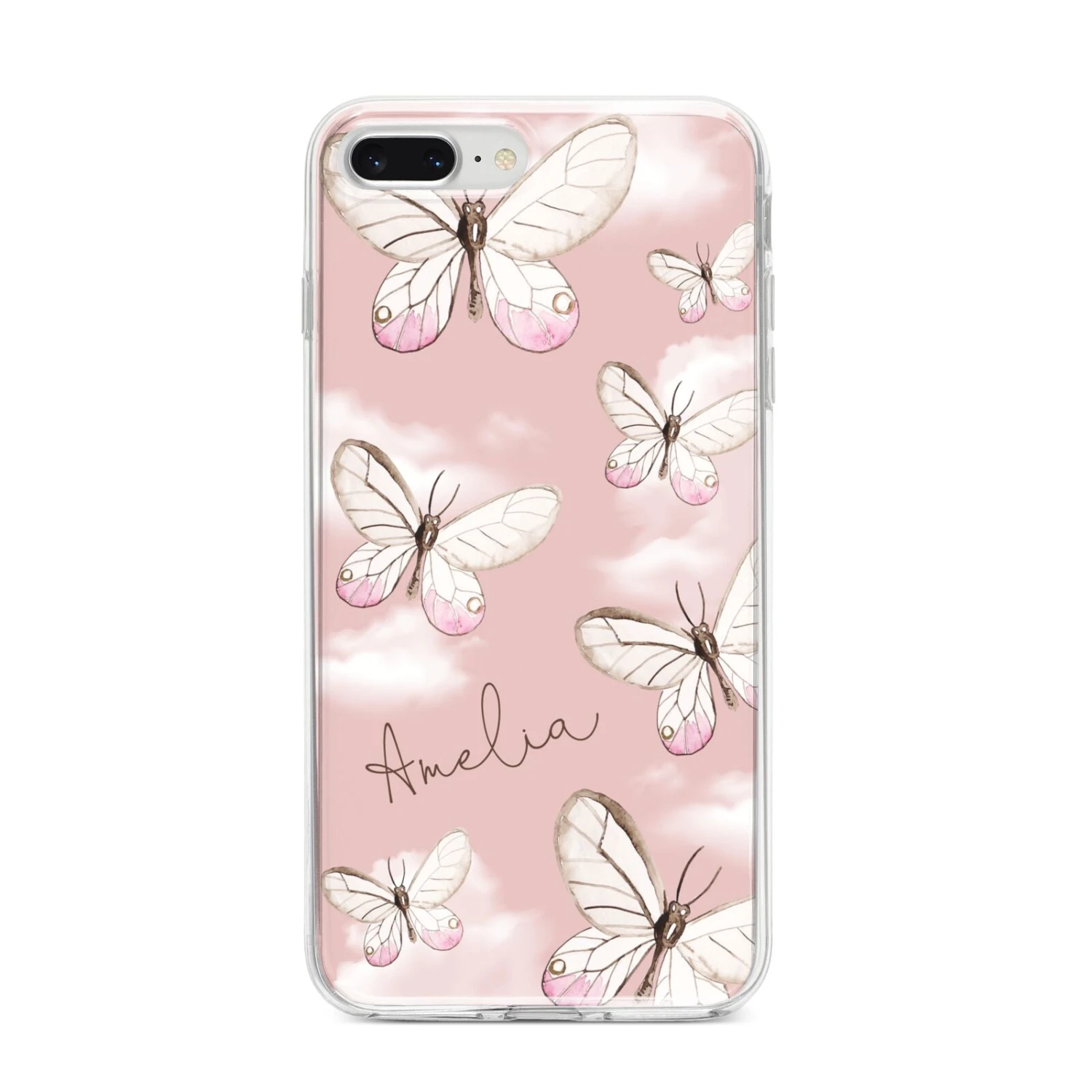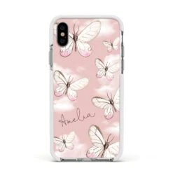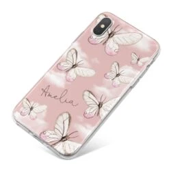 Our Pink Butterflies Personalised Apple iPhone Case is a striking design with pink butterflies, set against a pink sky with clouds, and a name in our handwritten font. Customise with your own name to make it yours.