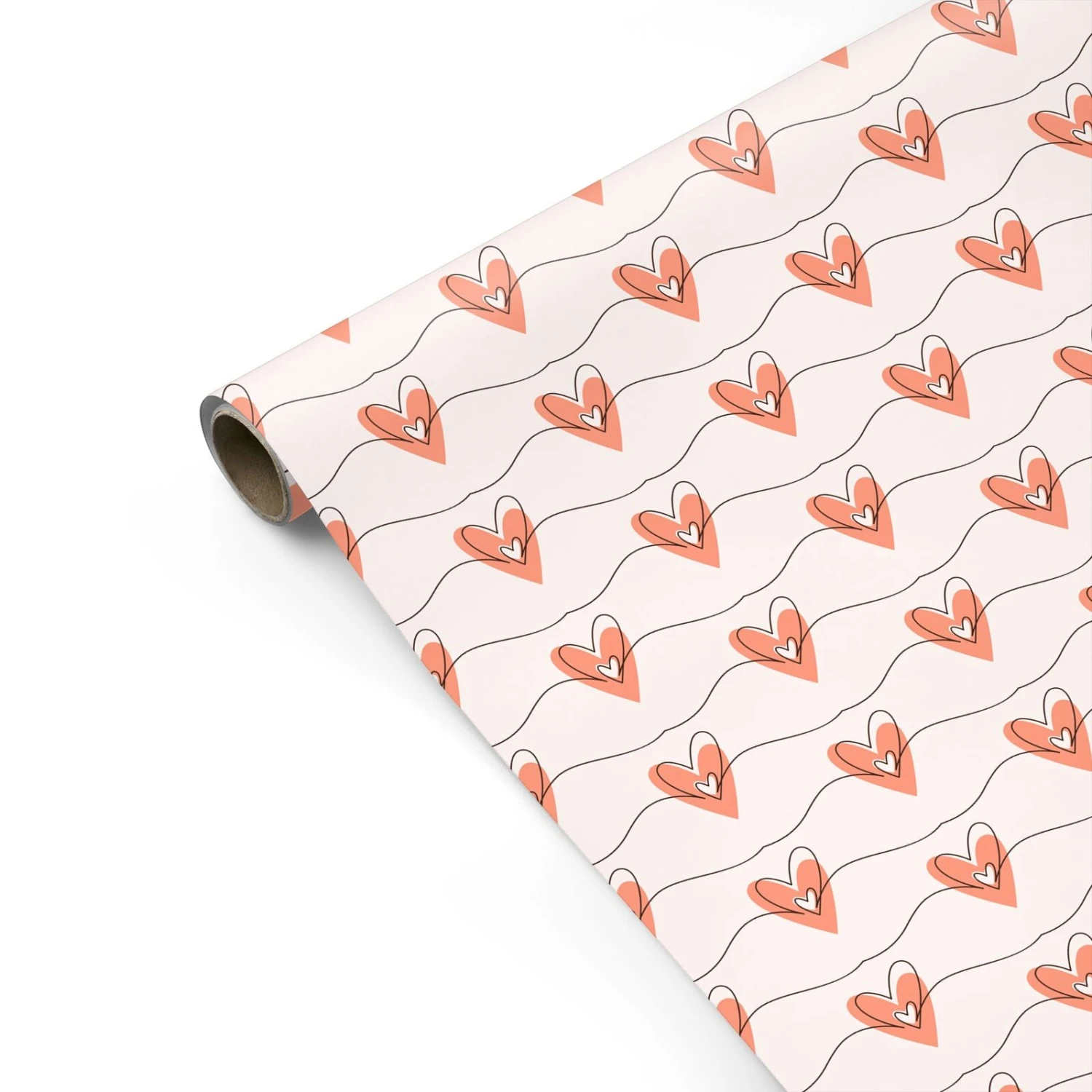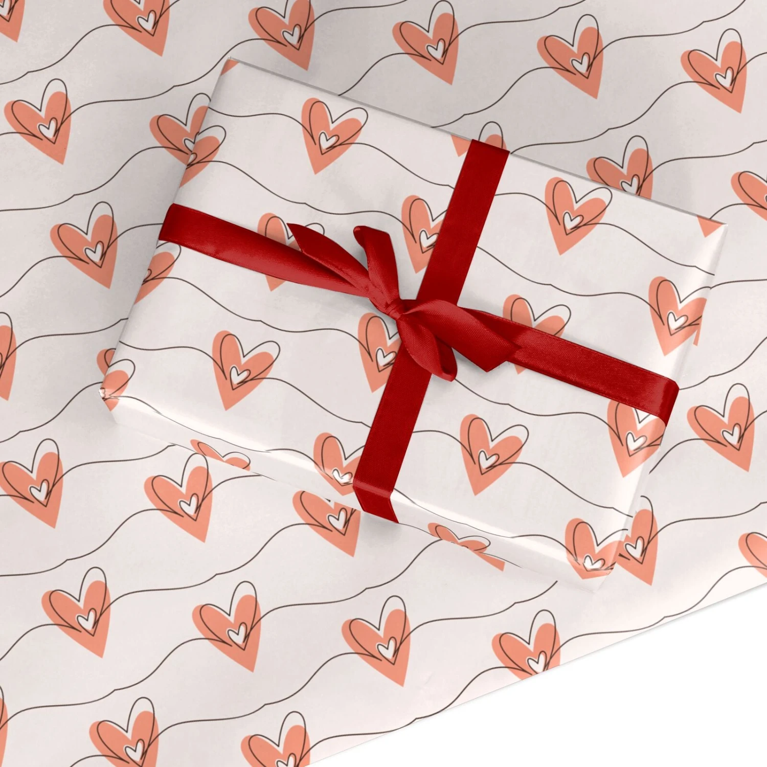This charming wrapping paper features a delicate peach and soft pink colour palette, adorned with heart motifs floating on wavy lines. The subtle hand-drawn aesthetic gives it a romantic yet modern feel, perfect for celebrating love on Valentine’s Day, anniversaries, or special occasions. Whether wrapping a thoughtful gift for a partner or a close friend, this design adds a warm and heartfelt touch to any present.